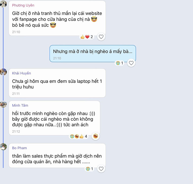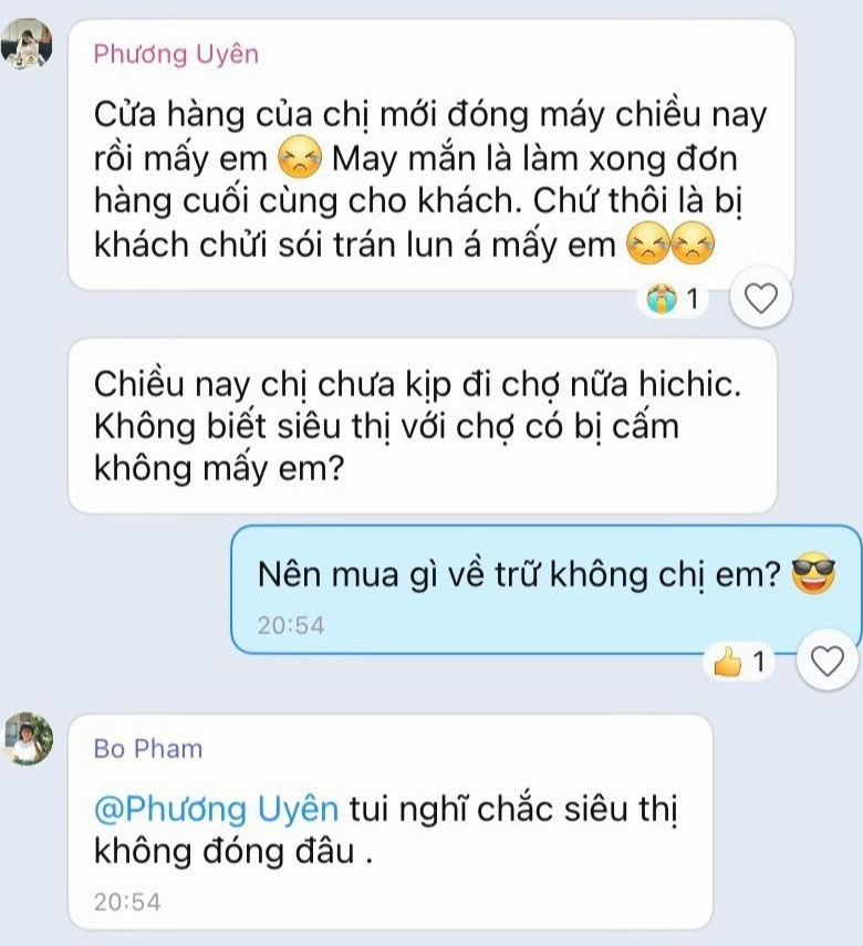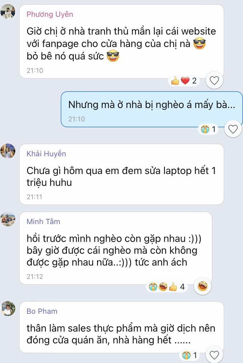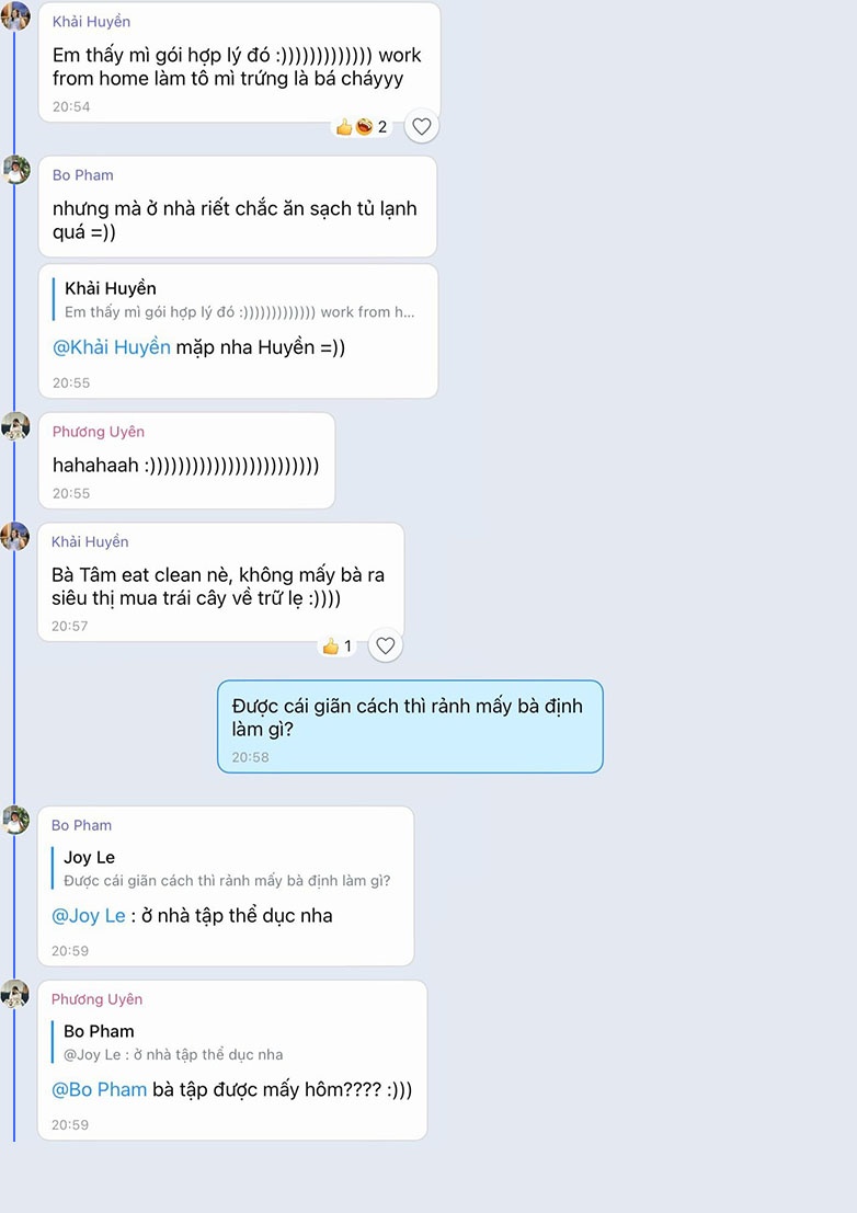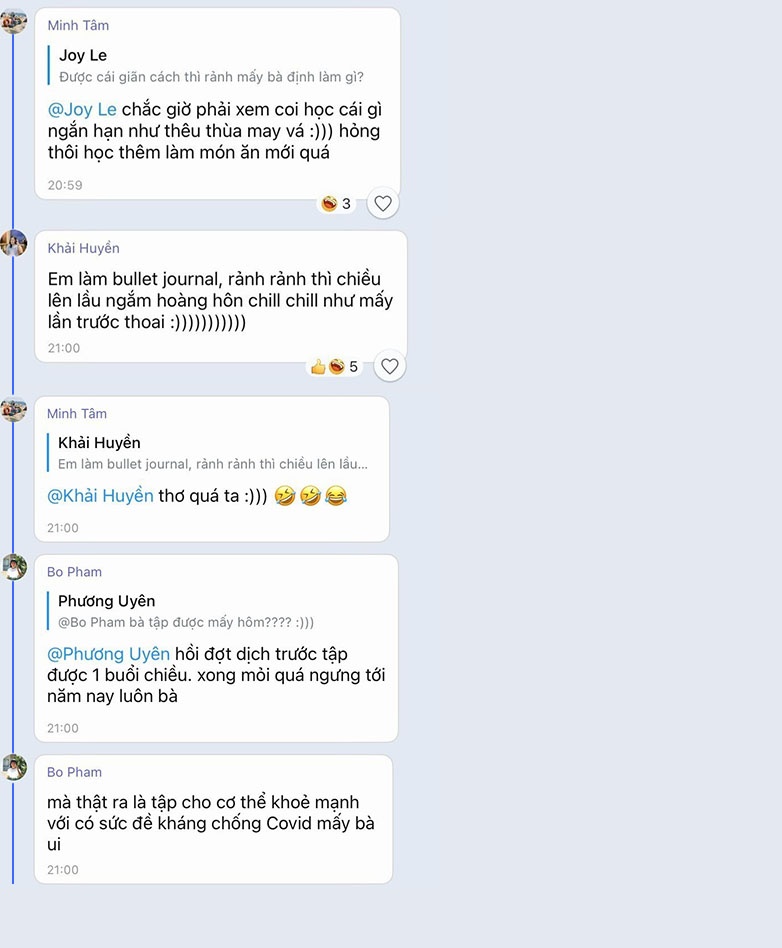 Trở lại với nhóm bạn của tôi, sau một lúc xôn xao, chúng tôi chuyển chủ đề sang việc ăn uống và hoạt động tại nhà. 2 tuần là khoảng thời gian dài và mỗi người đều có những dự định riêng.