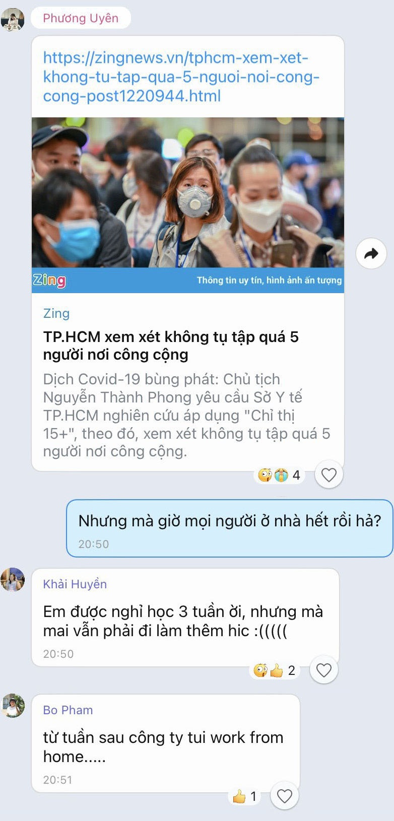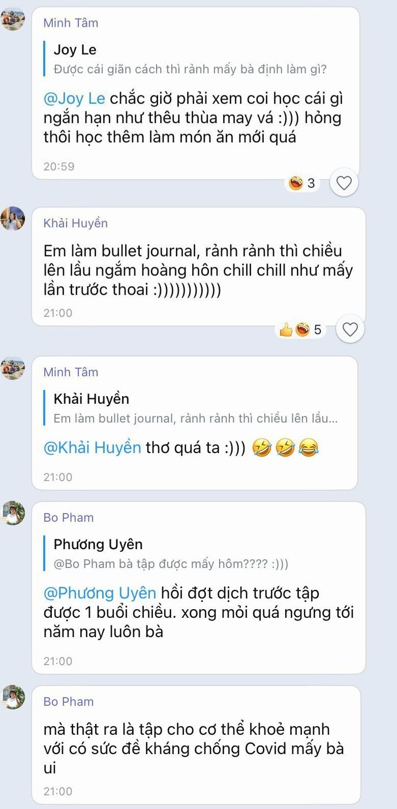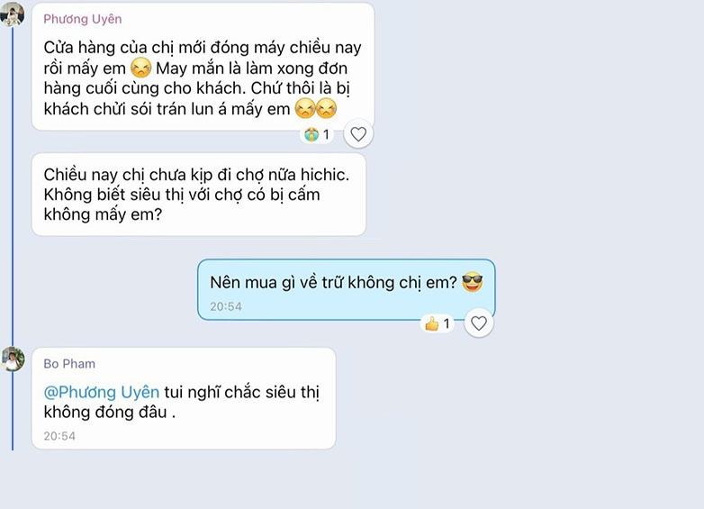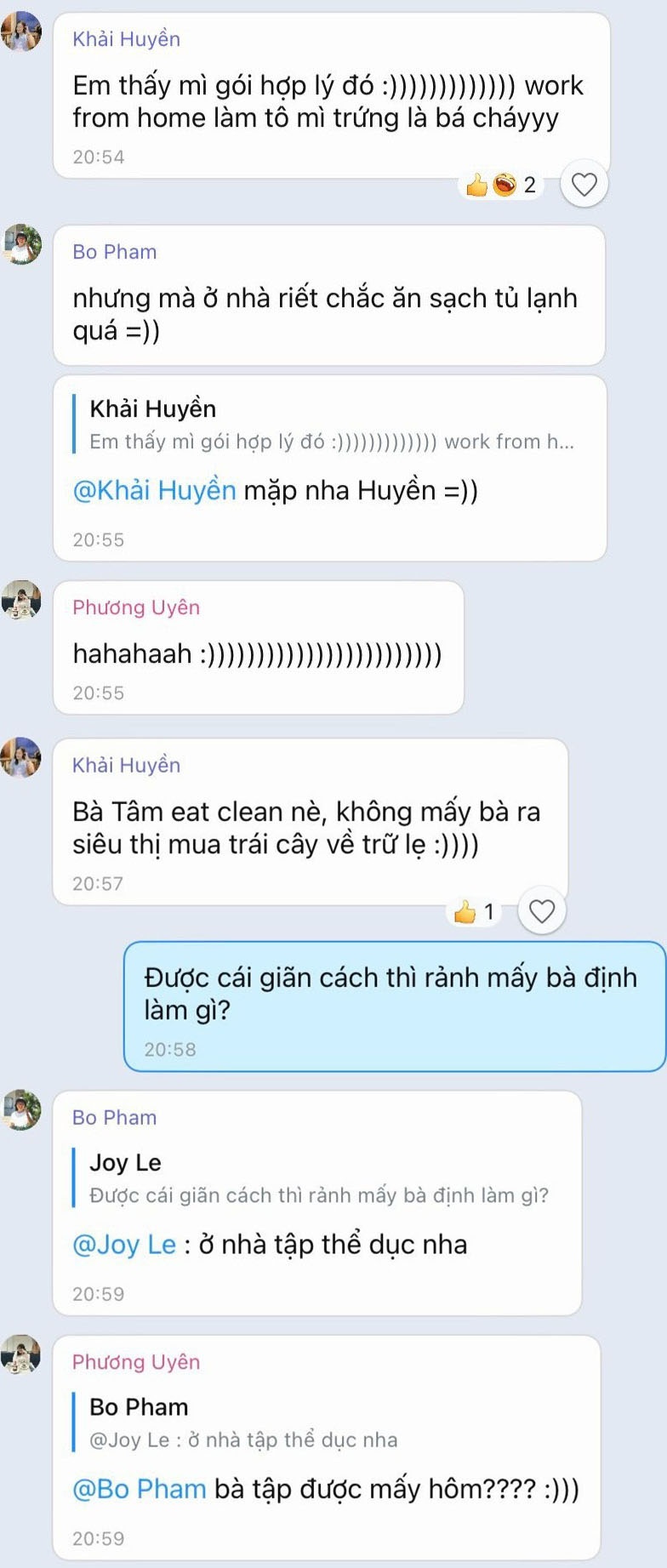 Trở lại với nhóm bạn của tôi, sau một lúc xôn xao, chúng tôi chuyển chủ đề sang việc ăn uống và hoạt động tại nhà. 2 tuần là khoảng thời gian dài và mỗi người đều có những dự định riêng.