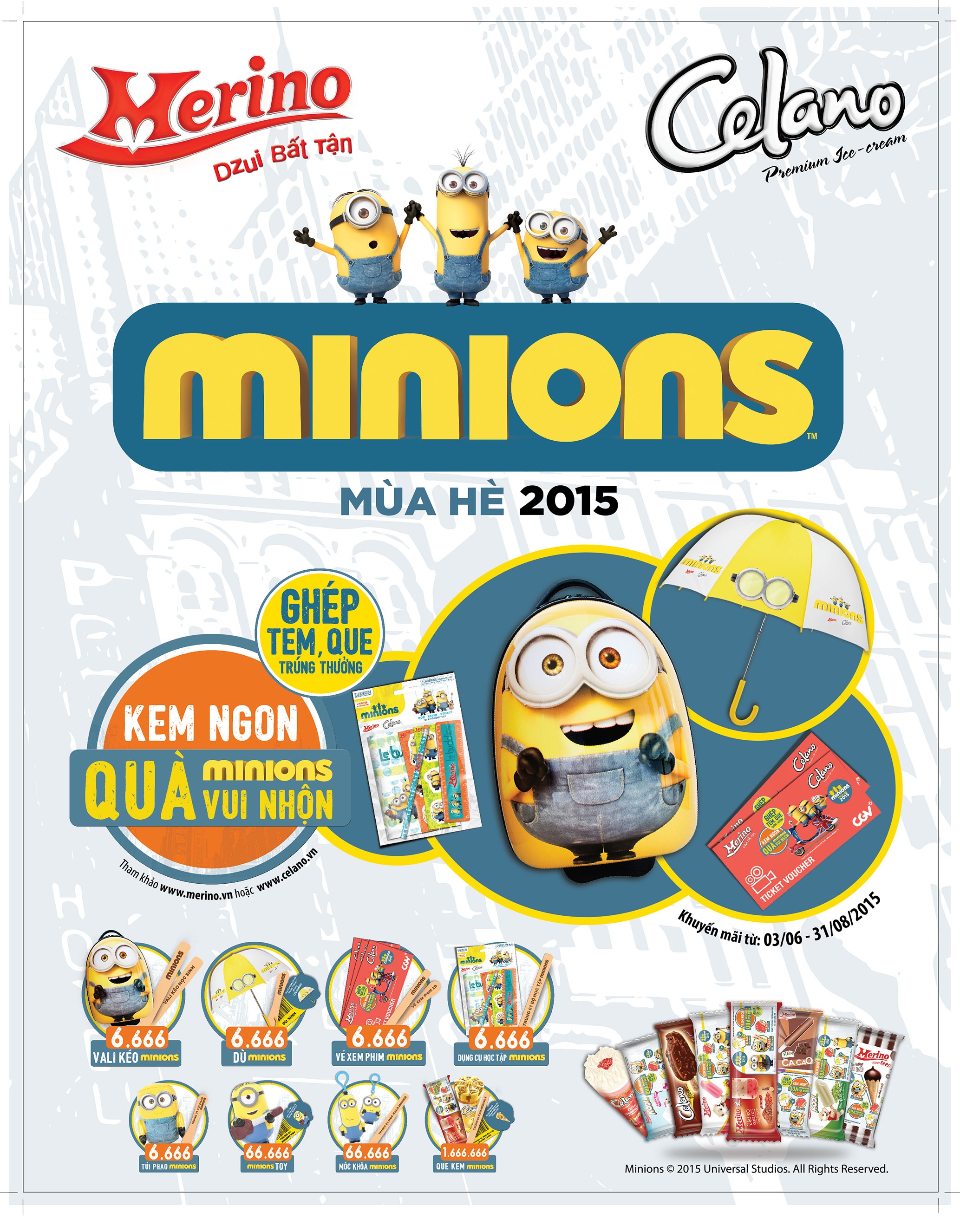 Các giải nhất, nhì, ba của chương trình đổi tem, que nhận quà Minions lần lượt là 6.666 vali kéo Minions, 6.666 chiếc dù Minions, 6.666 vé xem phim Mininons. Ngoài ra, hàng nghìn bộ dụng cụ học tập, túi phao, móc khóa và những vật dụng đáng yêu khác cũng đang chờ bạn rinh về. Đặc biệt, phần thưởng có 1.666.666 que kem Merino và Celano sẵn sàng để bạn giải nhiệt mùa hè. Bạn sẽ nhận được ngay một que kem Merino X nếu sưu tập đủ 5 que kem có chữ "Minions" được in trên thân que.
