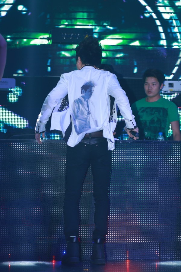 | Trong đêm nhạc, Bằng Cường mặc áo in hình nam ca sĩ ở phía sau. |