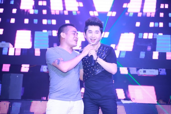 | Một fan nam nhiệt tình của Bằng Cường đã lên sân khấu hát chung với anh. |