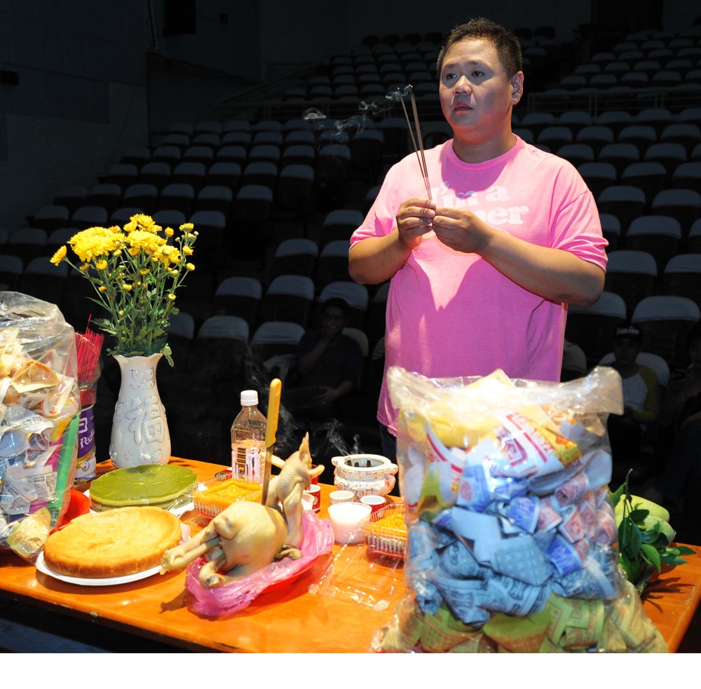 | Băng Di thắp hương khấn tổ nghiệp trước khi diễn. |