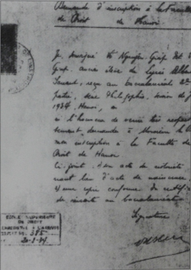 | Đơn đăng ký xin vào Luật khoa Đại học của ông. |