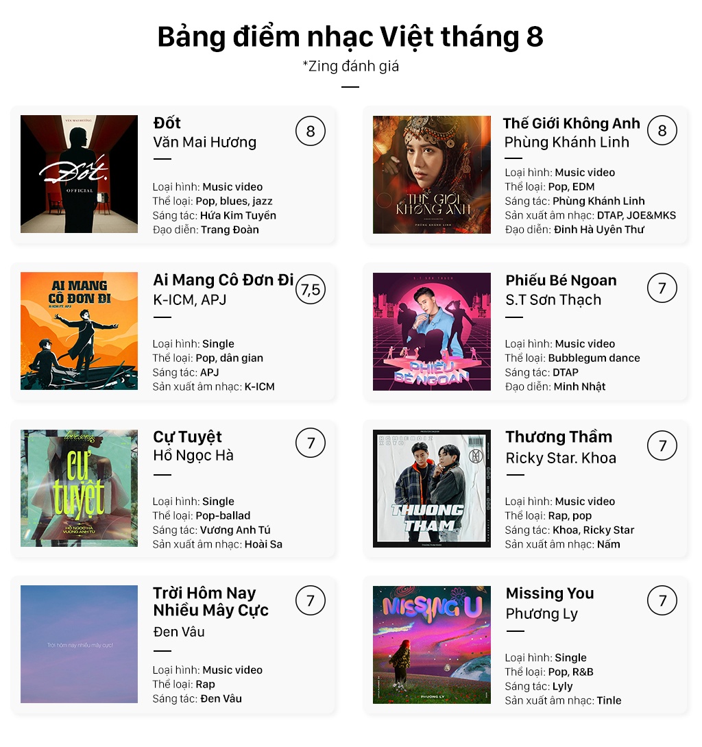 Bảng điểm nhạc Việt tháng 8: Văn Mai Hương dẫn đầu