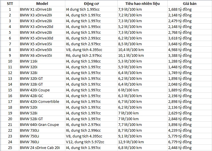 Trong các model BMW đang được phân phối chính hãng tại Việt Nam, mẫu xe nhỏ 116i thuộc 1-series có giá thấp nhất (1,288 tỷ đồng), cao nhất là 760Li thuộc dòng 7-series. Mức giá bán lẻ này dành cho các phiên bản với trang bị tiêu chuẩn theo xe và đã bao gồm thuế nhập khẩu, thuế tiêu thụ đặc biệt và thuế giá trị gia tăng. Các chi phí khác như thuế trước bạ, lệ phí đăng kí, đăng kiểm không tính vào giá bán xe.