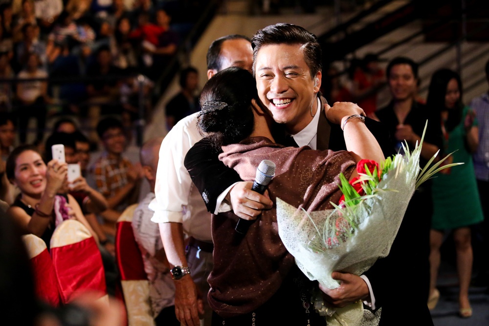 | Anh cười tít mắt khi được một khán giả trung niên chạy lên sân khấu tặng hoa và ôm chặt. |