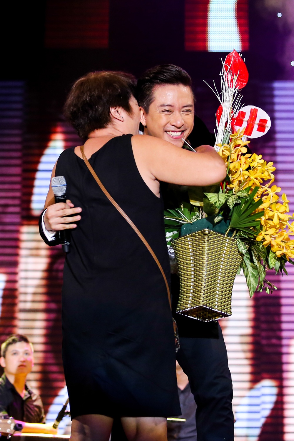 | Một trong những hình ảnh đẹp gây xúc động trong liveshow tối qua khi nam ca sĩ tặng hoa và ôm mẹ. |