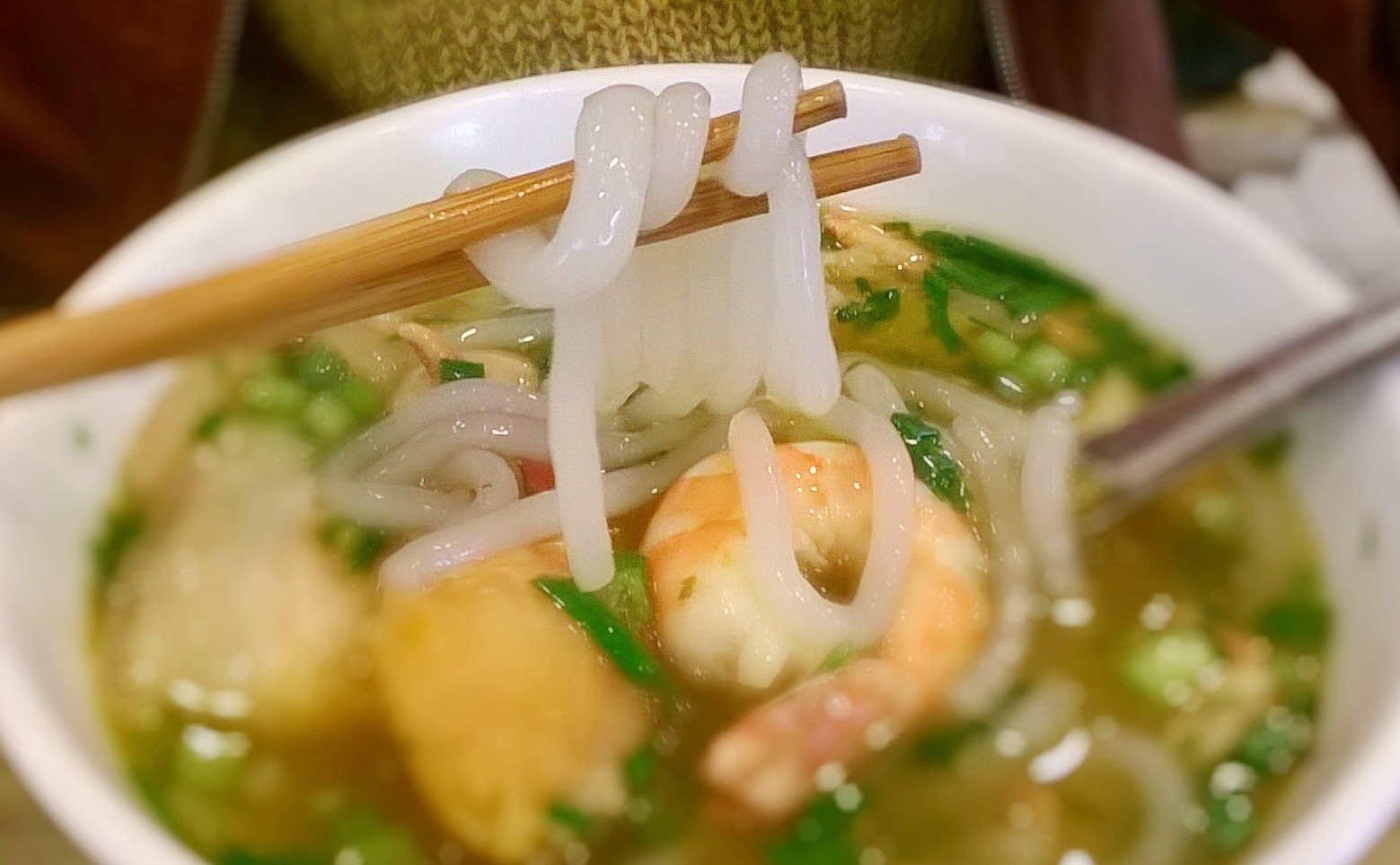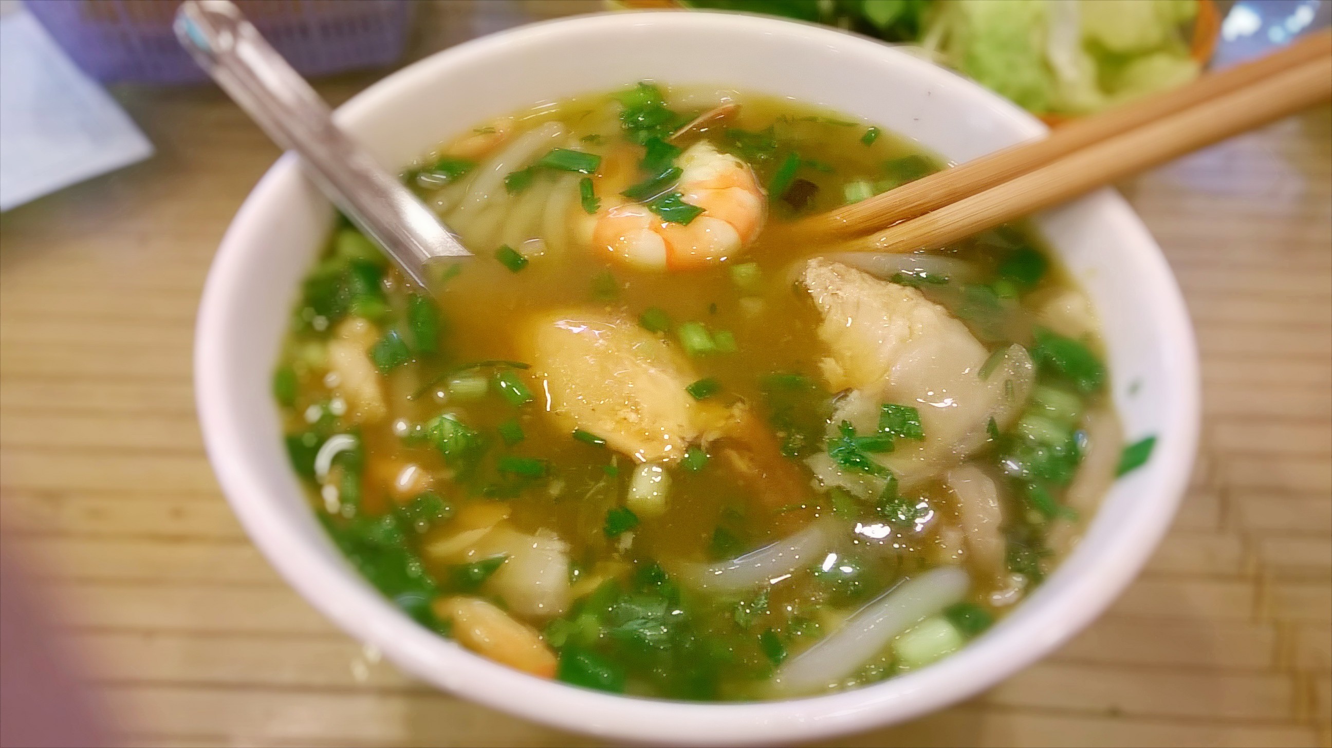Dùng đũa lùa vài đường, tôi thấy những sợi bánh canh béo tròn múp míp song chỉ lõng bõng. Nhưng lấy kinh nghiệm của người đã từng thưởng thức bánh canh, tôi “trấn an” anh bạn cũng là tự vỗ về mình: “Sợi bánh canh ăn bứ hơn bún phở nhiều nên cho ít là đúng!”.