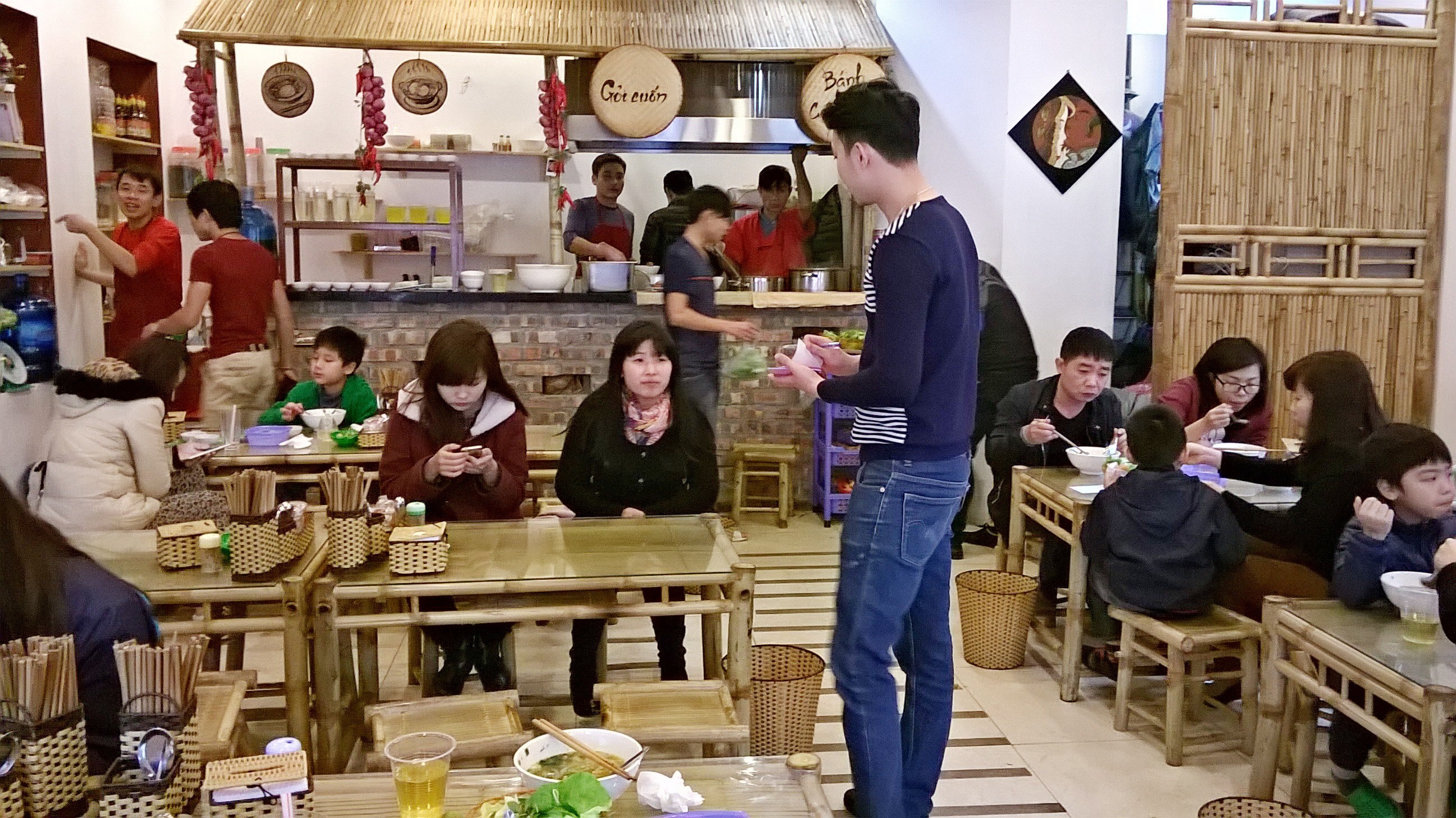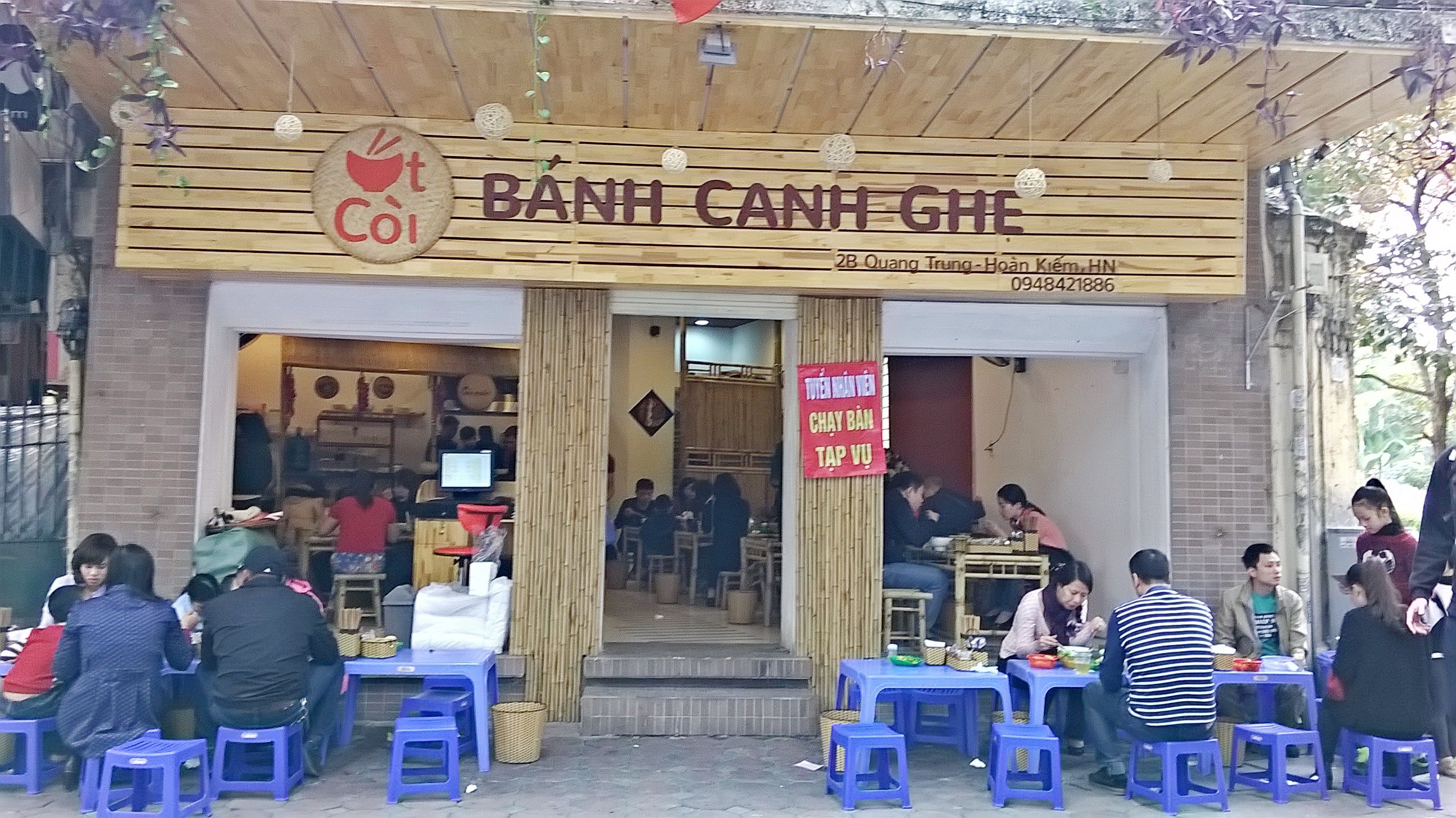 Thời gian gần đây, nếu có dịp tạt ngang qua đầu phố Quang Trung (đoạn giao với phố Nhà Chung, Hà Nội), nhiều người sẽ thấy một quán ăn treo tấm biển lớn “Bánh canh ghẹ”. Quán nhỏ nhưng lịch sự, bắt mắt với phong cách mây tre và đặc biệt là luôn đông khách. Dù giờ mở cửa hạn chế, buổi sáng tầm từ 10-11h đến khoảng 14h, buổi chiều thì sau 17h nhưng cứ mở là tấp nập, đông vui.