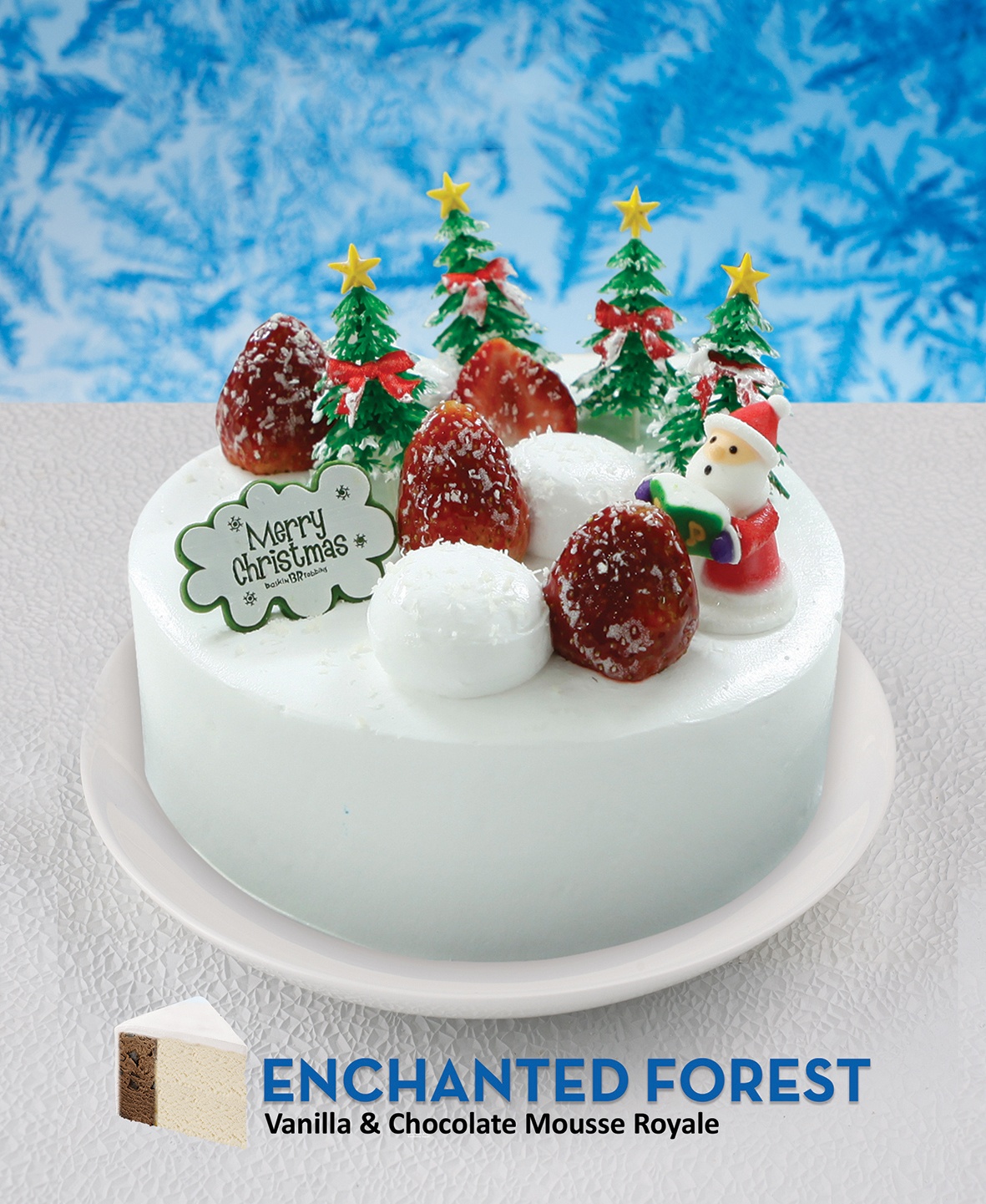 | Bạn đã từng bắt gặp hình ảnh Ông già Noel cất tiếng hát trong khu rừng tuyết chưa? Ai nói rằng khu vườn đầy băng tuyết lại không mê hoặc lòng người bởi những giai điệu giáng sinh thánh thót của Ông Già Noel. Enchanted Forest đã mang đến cho bạn một khu vườn như thế. Chiếc bánh dành cho tín đồ yêu thích hai mùi kem truyền thống: vanilla và chocolate mousse royale. |