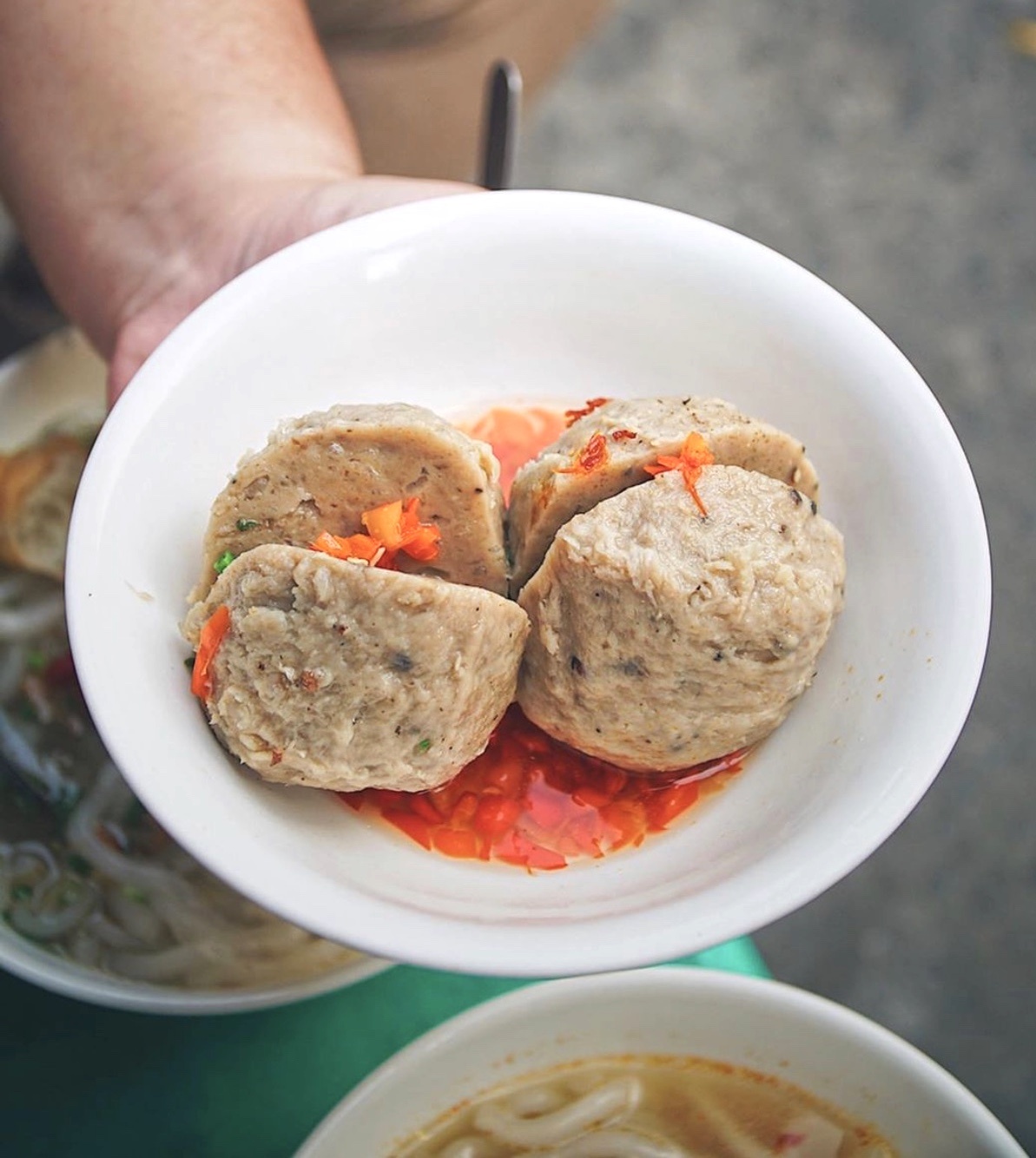 Hàng bánh canh bò viên trên đường Nguyễn Văn Nguyễn, quận 1, thu hút tín đồ sành ăn nhờ nhân bò viên khổng lồ lạ mắt, đượm hương tiêu. Sợi bánh canh có độ dai vừa phải. Thịt heo xắt lát quyện nước dùng nóng hổi tạo phiên bản ẩm thực thơm ngon. Ảnh: Foodholicvn. |