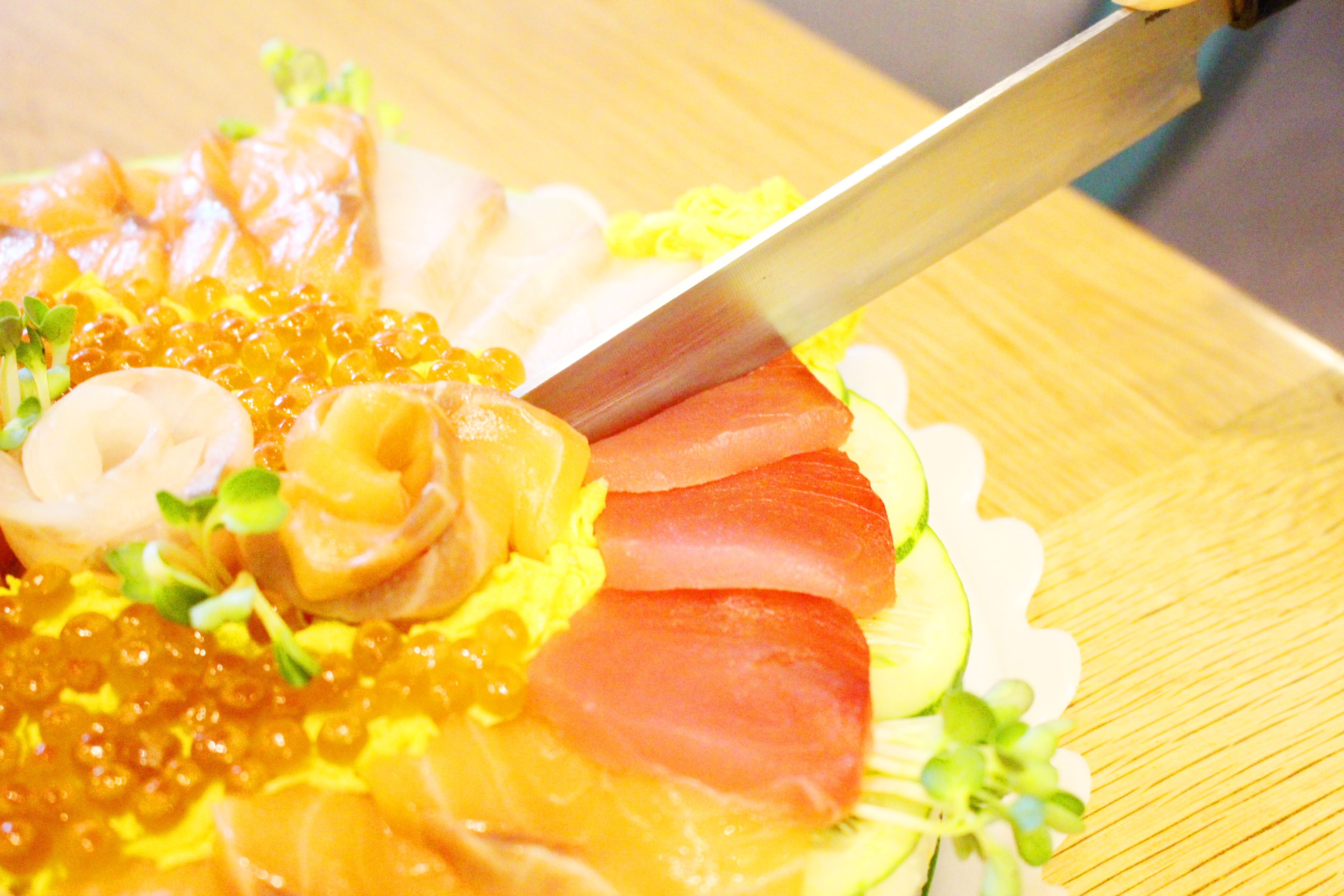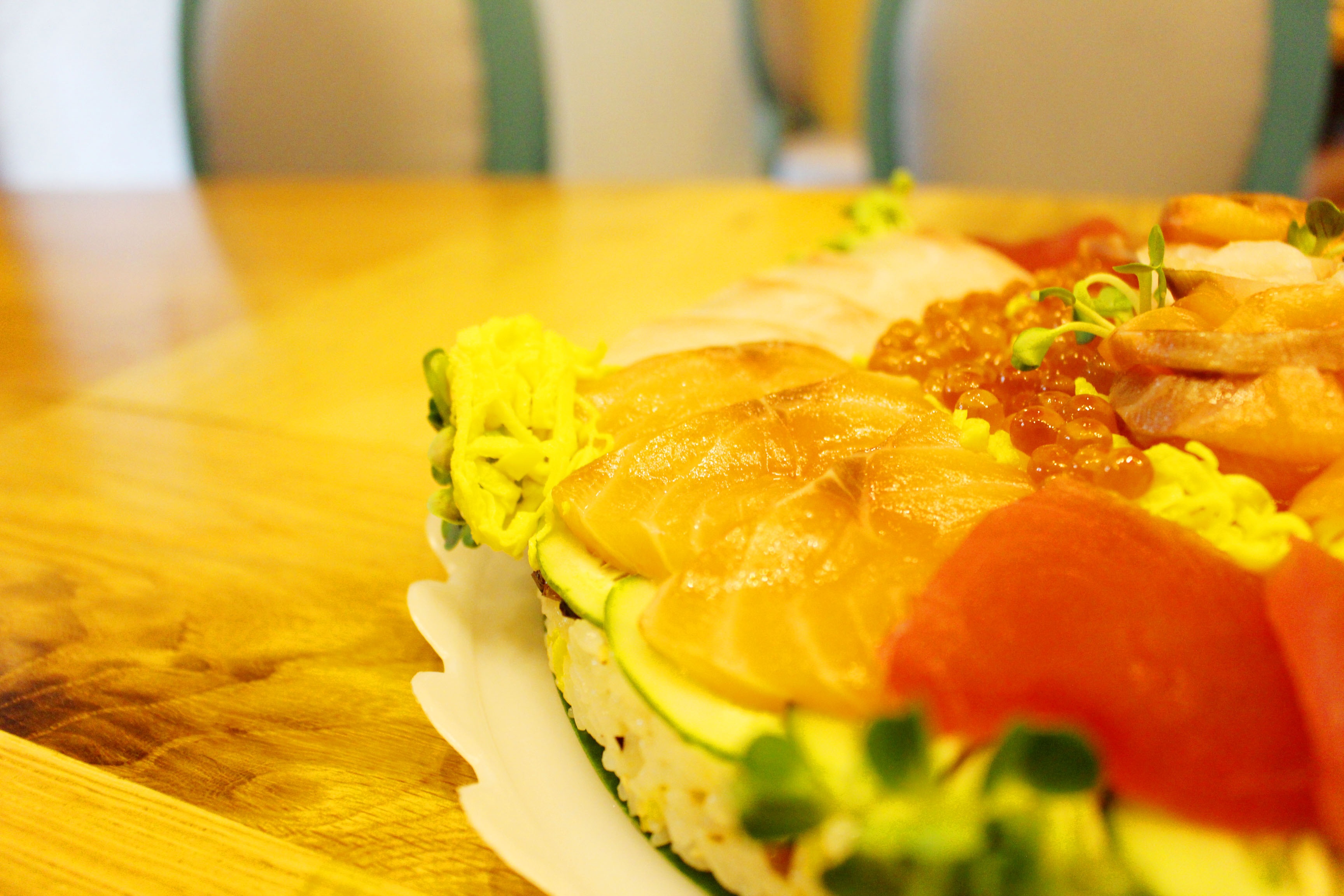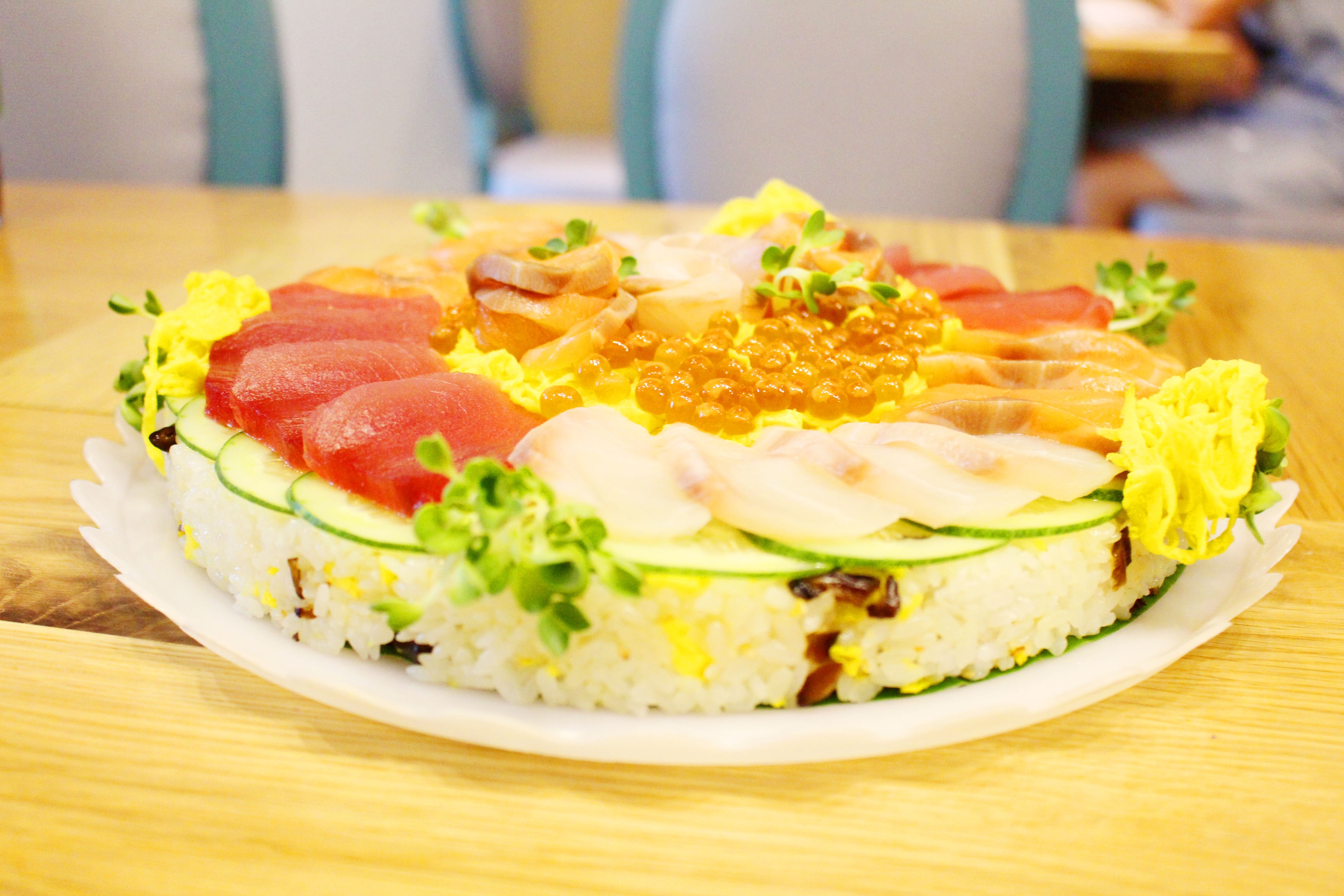 Bánh được trang trí bằng các món sashimi (đồ sống) như cá ngừ, cá hồi, trứng cá trích, trứng tôm… Các món này được sắp xếp khéo léo, với màu sắc đặc trưng của chúng như màu cam của cá hồi, đỏ thẫm của cá ngừ, màu vàng của trứng, màu đỏ cam trong suốt của trứng cá hồi.