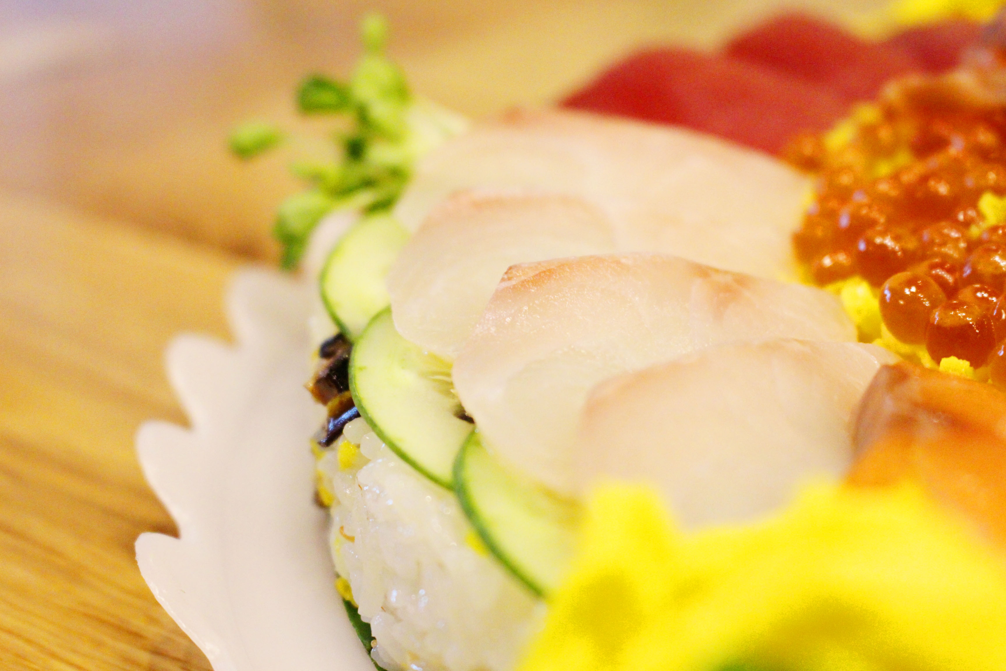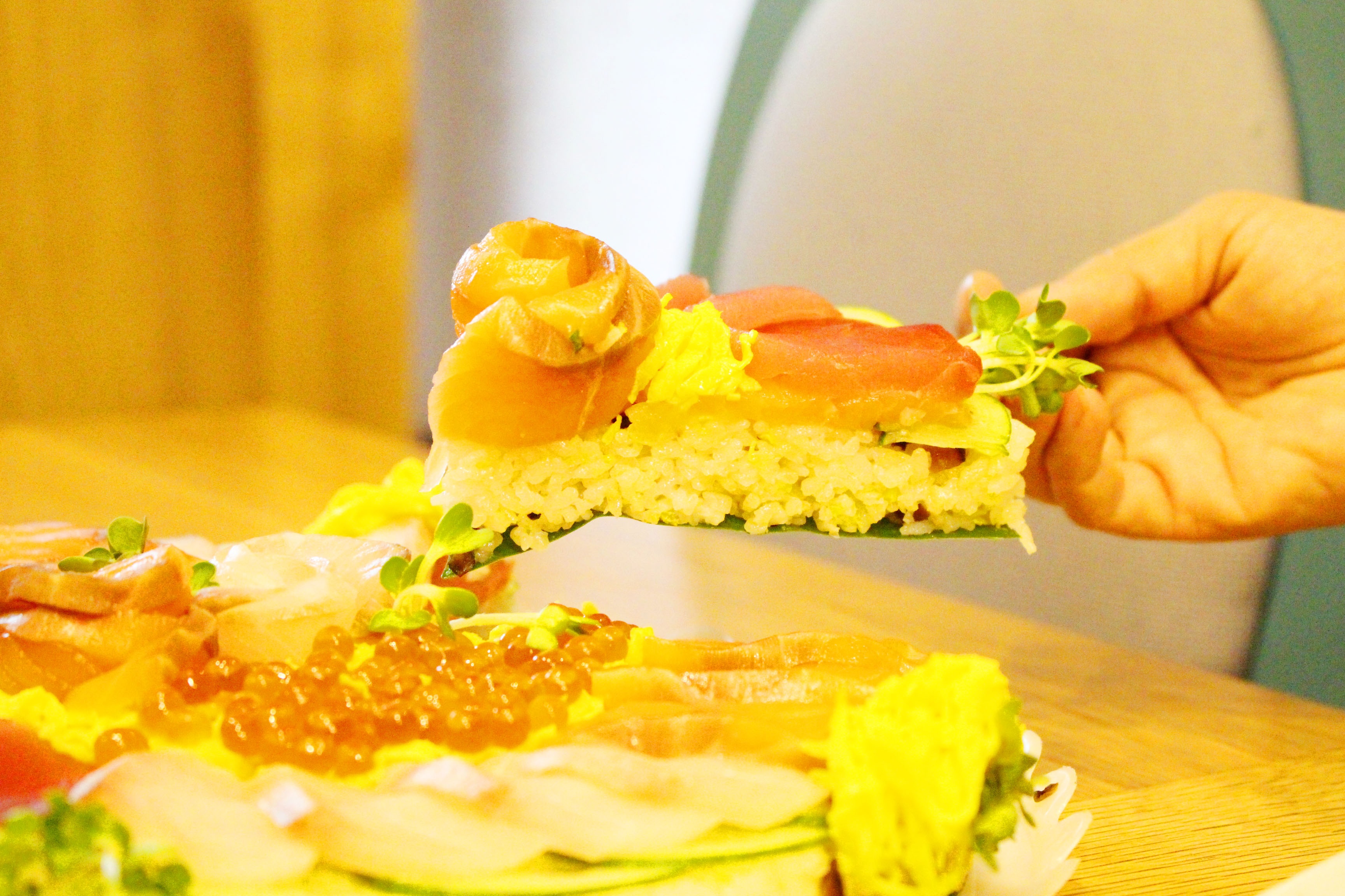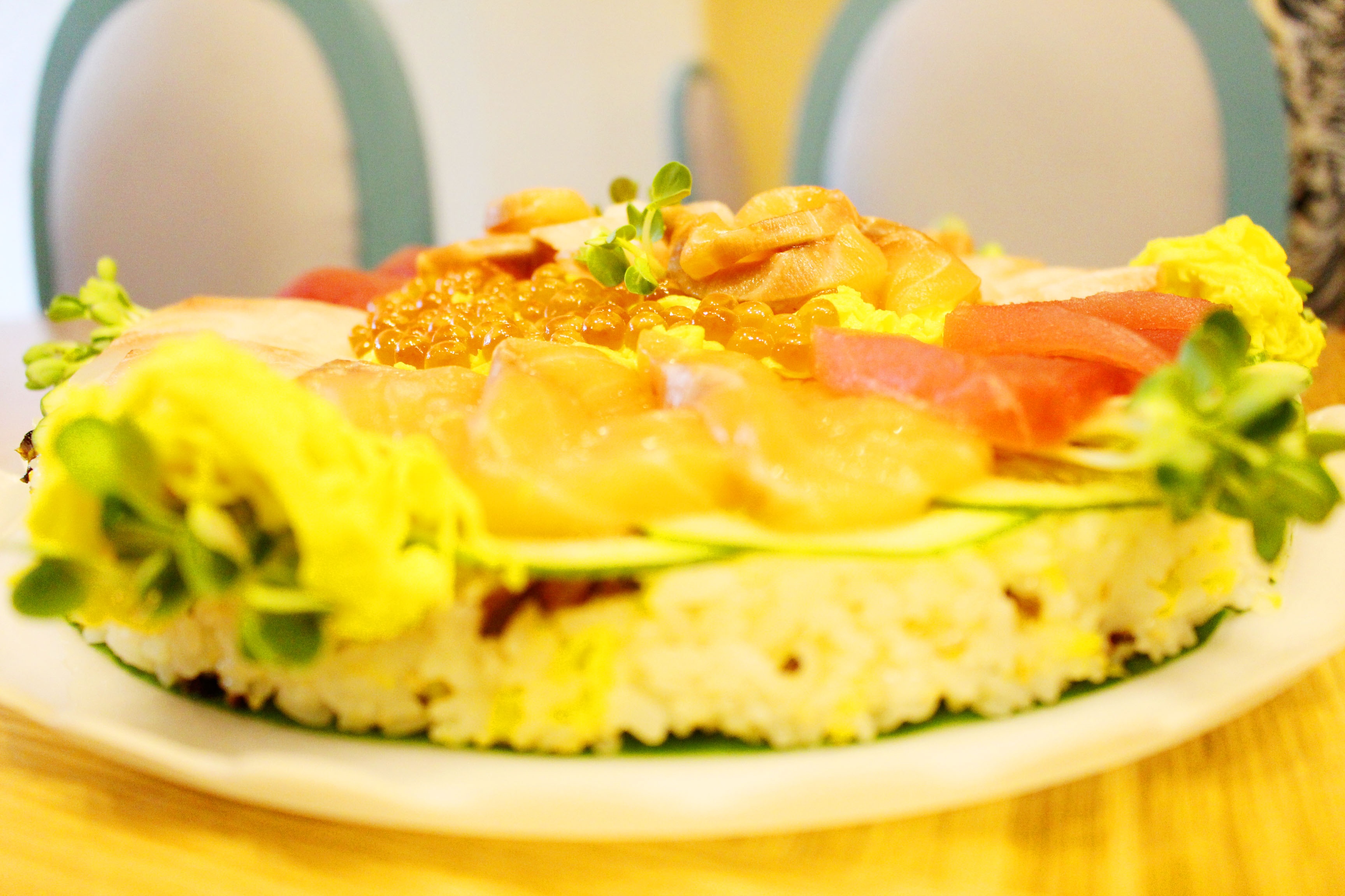 Những miếng sashimi tươi ngon với màu sắc đặc trưng và các loại rau quả tạo nên lớp trang trí hoàn hảo, khiến "bánh cơm" trở nên rực rỡ, đầy mê hoặc.