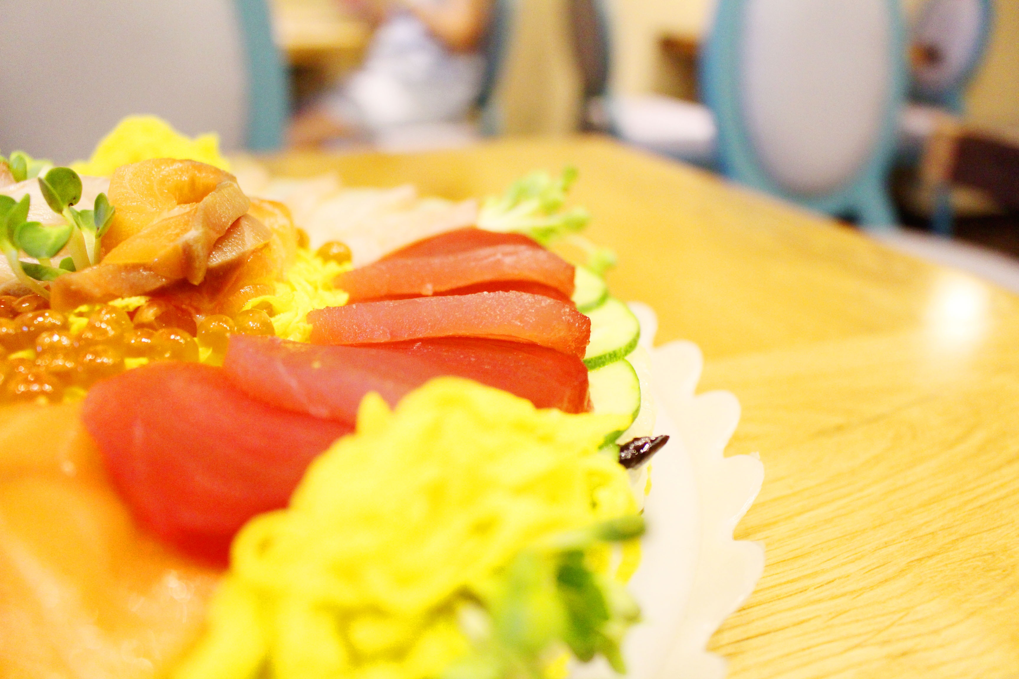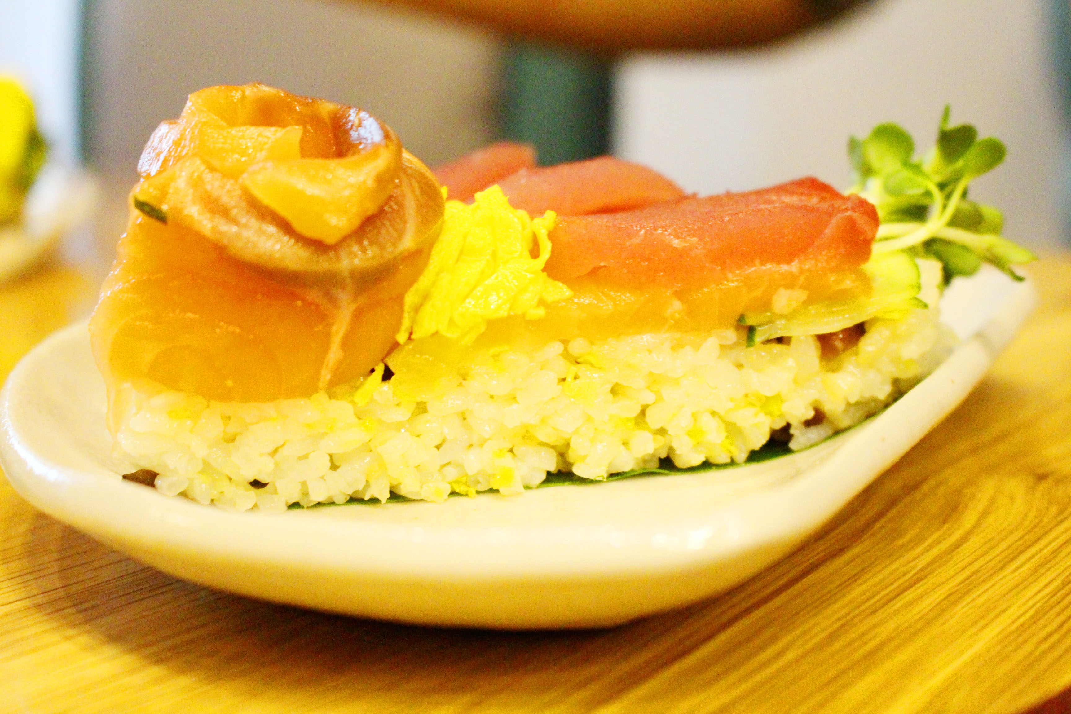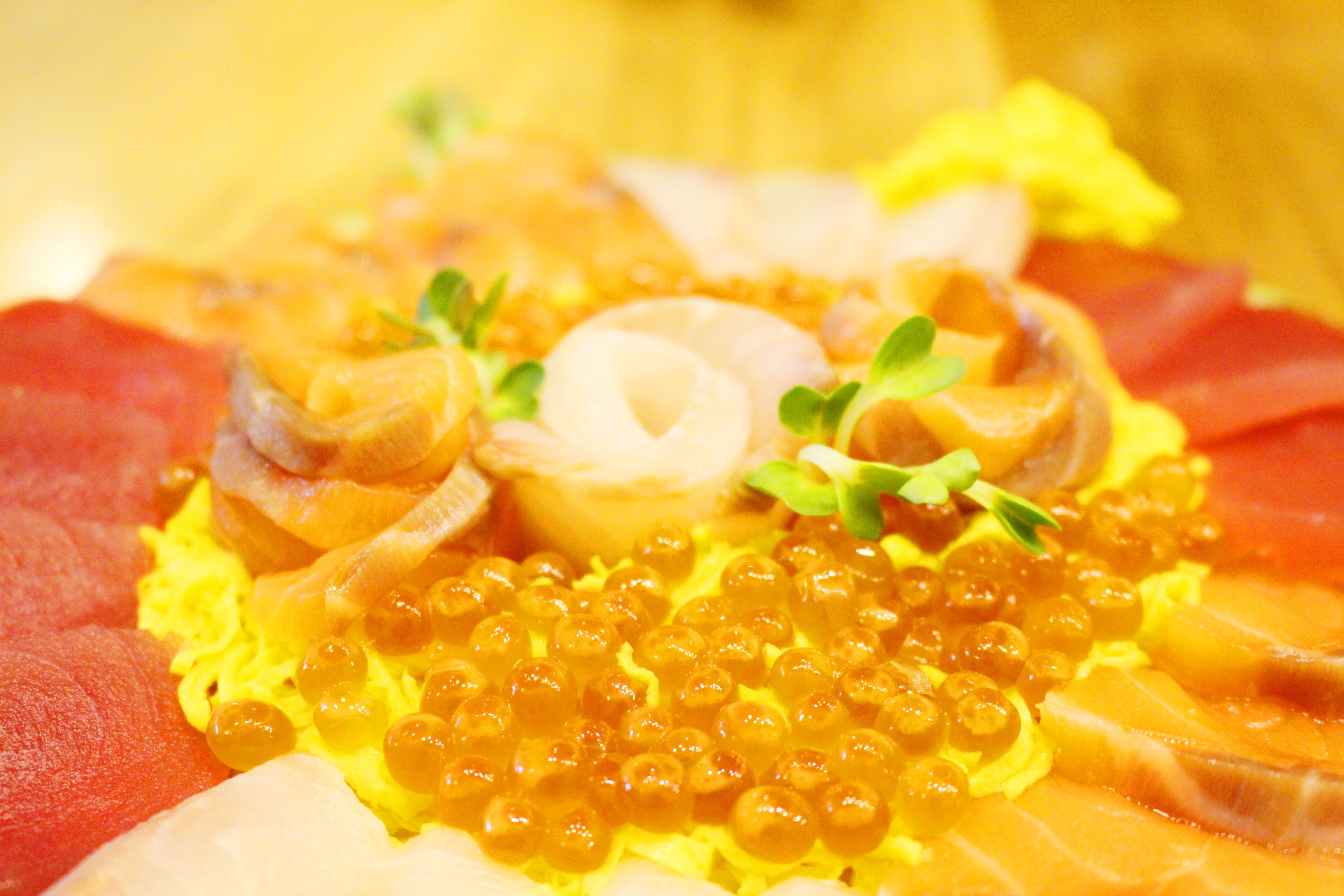 Những miếng sashimi tươi ngon với màu sắc đặc trưng và các loại rau quả tạo nên lớp trang trí hoàn hảo, khiến "bánh cơm" trở nên rực rỡ, đầy mê hoặc.