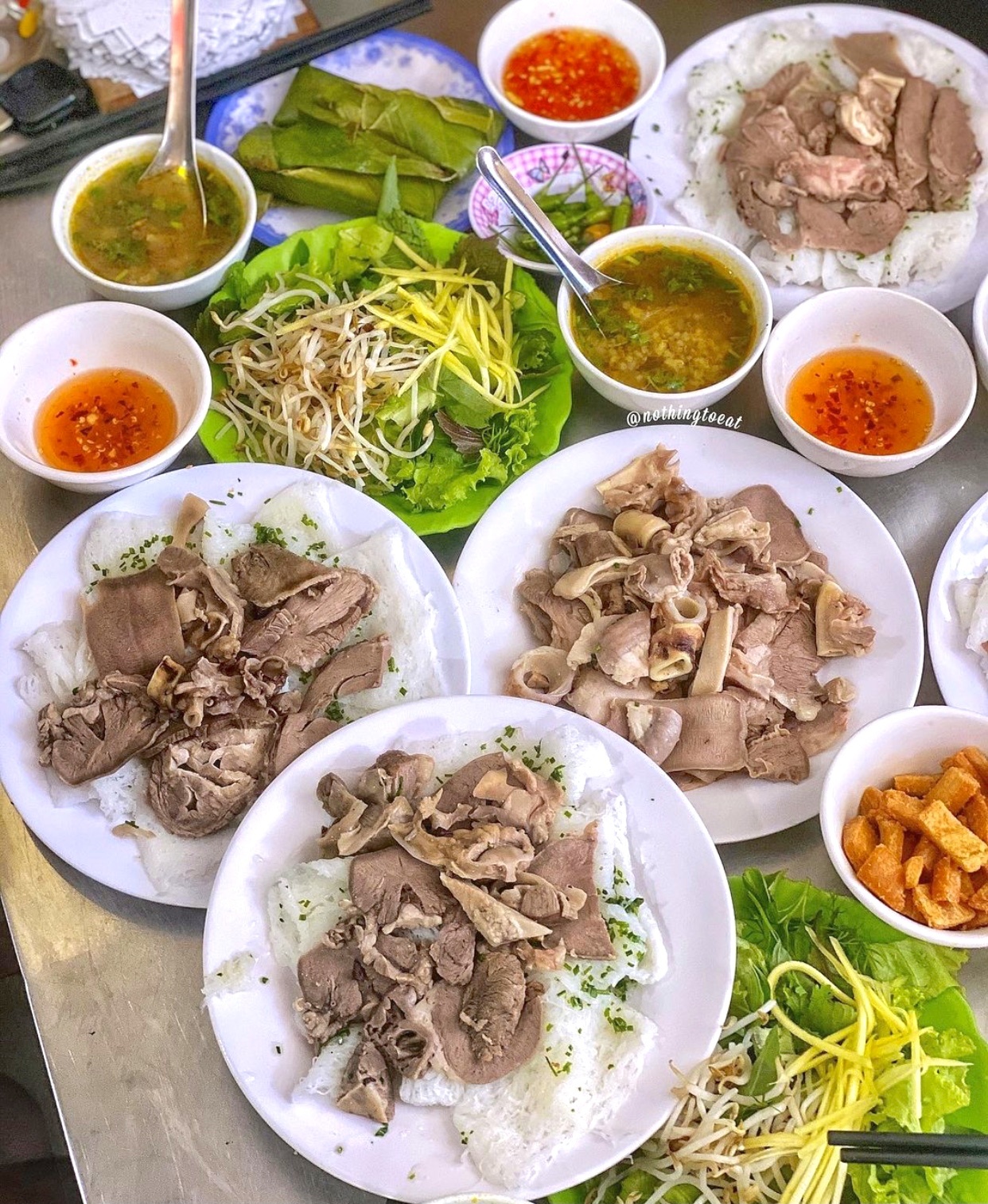 Bánh hỏi Diêu Trì ở huyện Tuy Phước nổi tiếng nhất Bình Định. Người chế biến kết hợp bánh hỏi làm từ bột gạo với các loại lòng heo luộc (hấp), ăn kèm bánh tráng mỏng, bánh tráng nướng, rau thơm, nước mắm ớt... Họ cũng thường phục vụ bánh hỏi lòng heo cùng cháo nấu loãng, có rắc chút hành, tiêu dậy mùi thơm hấp dẫn. Ảnh: Ryanhuynh33. |