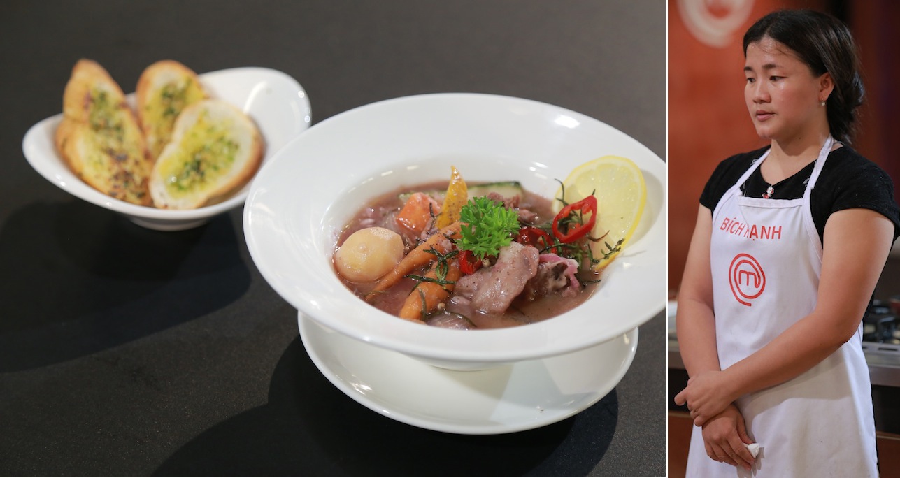 | Thừa nhận món Thỏ nấu rượu vang của mình không ngon bằng đối thủ Quốc Việt, Bích Hạnh là người phải chia tay top 5. |