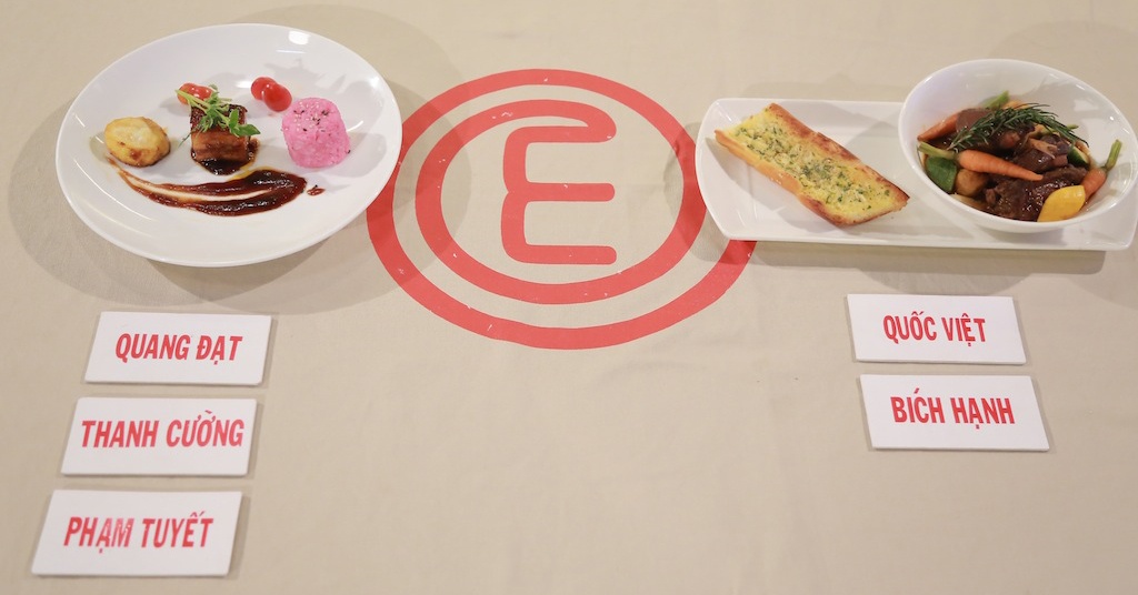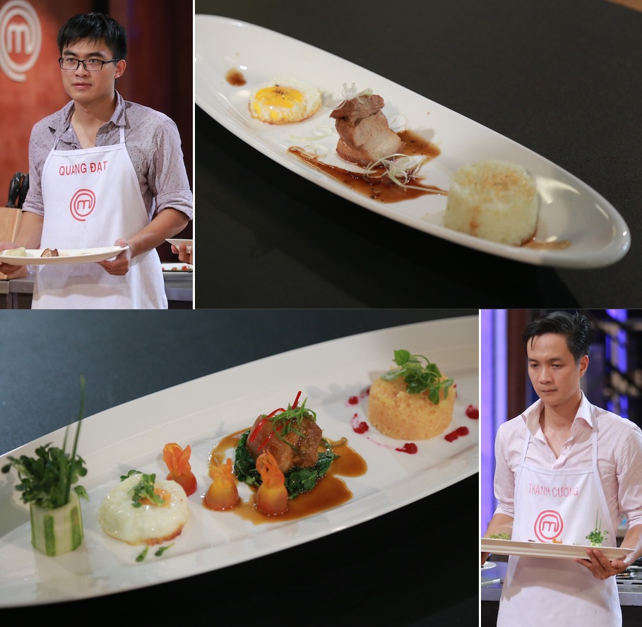 | Với món Thịt kho của Thanh Cường, ngoài việc nhận được sự đánh giá rất cao về cách trang trí, sự sáng tạo của anh trong việc sử dụng rượu mai quế lộ không mấy thành công khi làm cho vị của món ăn thay đổi. Trong khi đó, Quang Đạt dùng rượu sa kê để nấu. Dù vậy, với cách phối hợp nguyên liệu tốt, cùng với Phạm Tuyết, Thanh Cường và Quang Đạt đã được an toàn. |