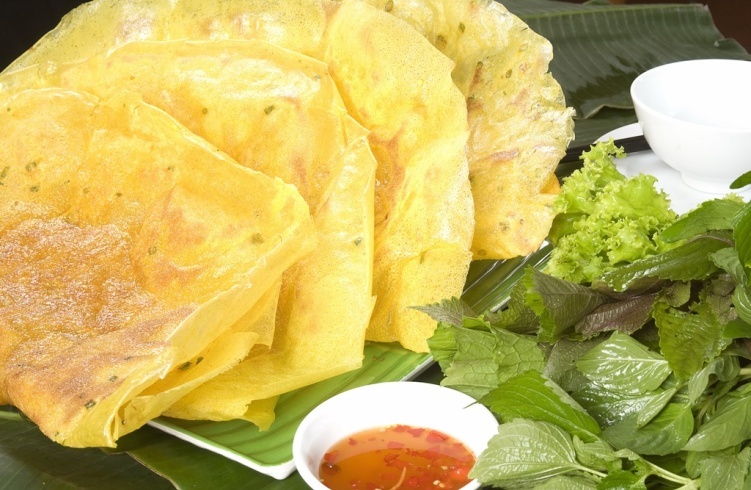 | Chiếc bánh xèo vàng ươm, giòn rụn bên rổ rau xanh mát. |