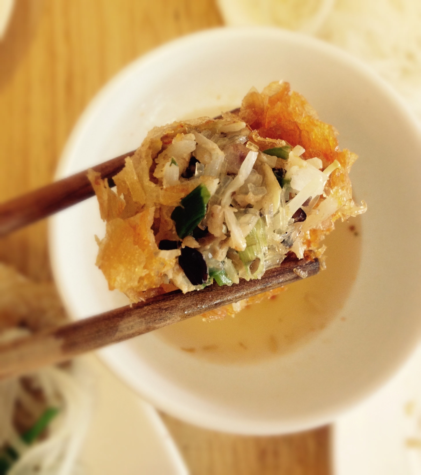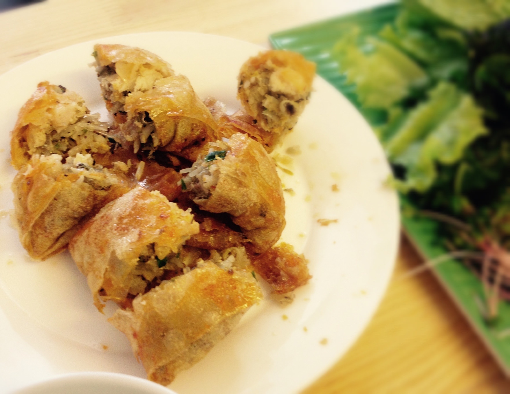 | Bún nem cua bể của quán có lớp vỏ rất giòn rụm, dễ ăn song nhược điểm là nhân cua còn "hẻo" nên nem chưa thể dậy mùi đặc trưng.