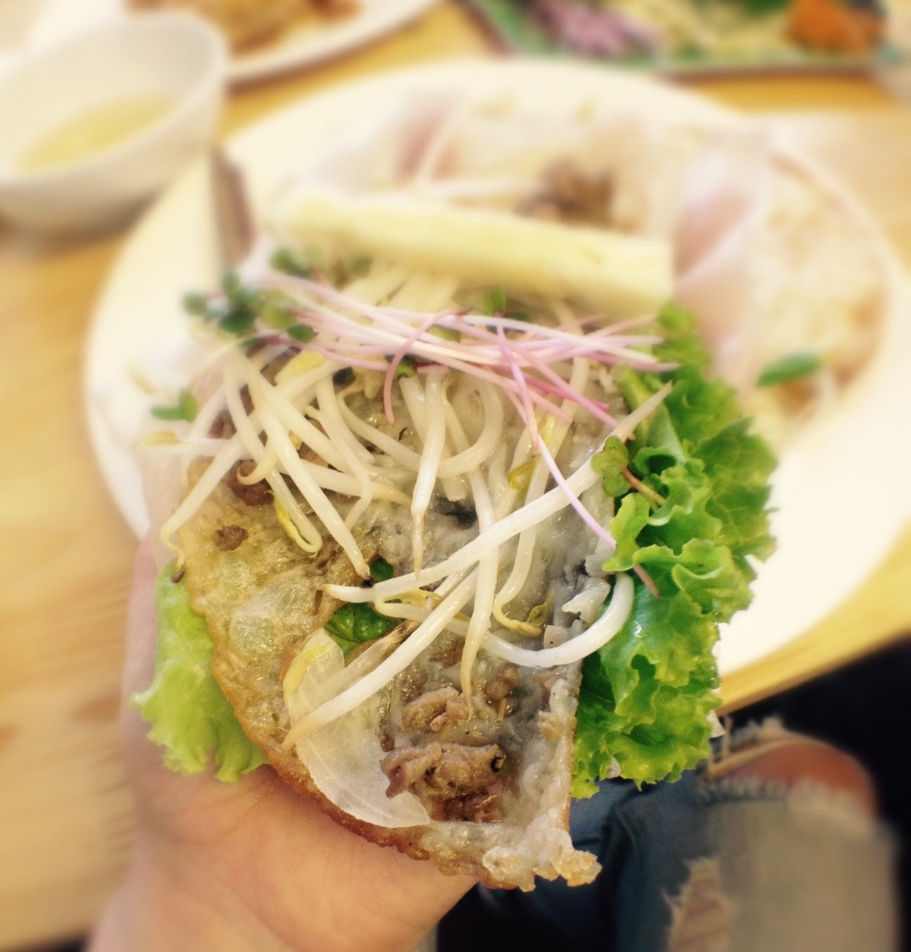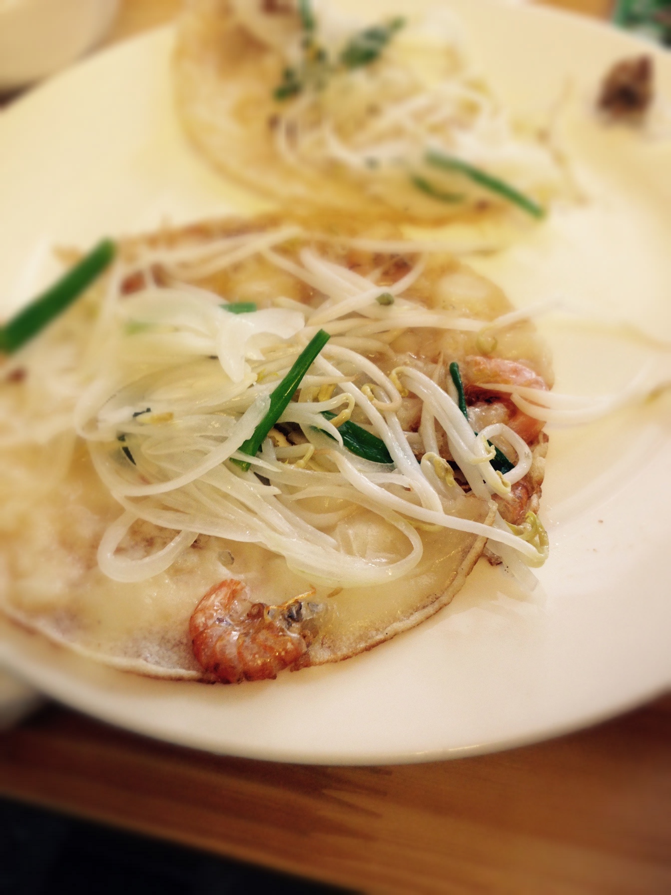 Bánh xèo ở đây vỏ dày, chỉ một mặt là giòn giòn cháy cạnh nhưng ăn rất khác biệt và ngon.