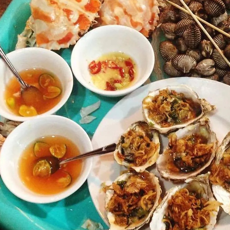 Buổi tối “đi ăn ốc” ở đây không chỉ là một cuộc hẹn mà là cả đại tiệc hải sản, vỏ đủ loại nhuyễn thể và giáp xác chất thành đống dưới chân, hương bơ tỏi chiên lan khắp không gian.