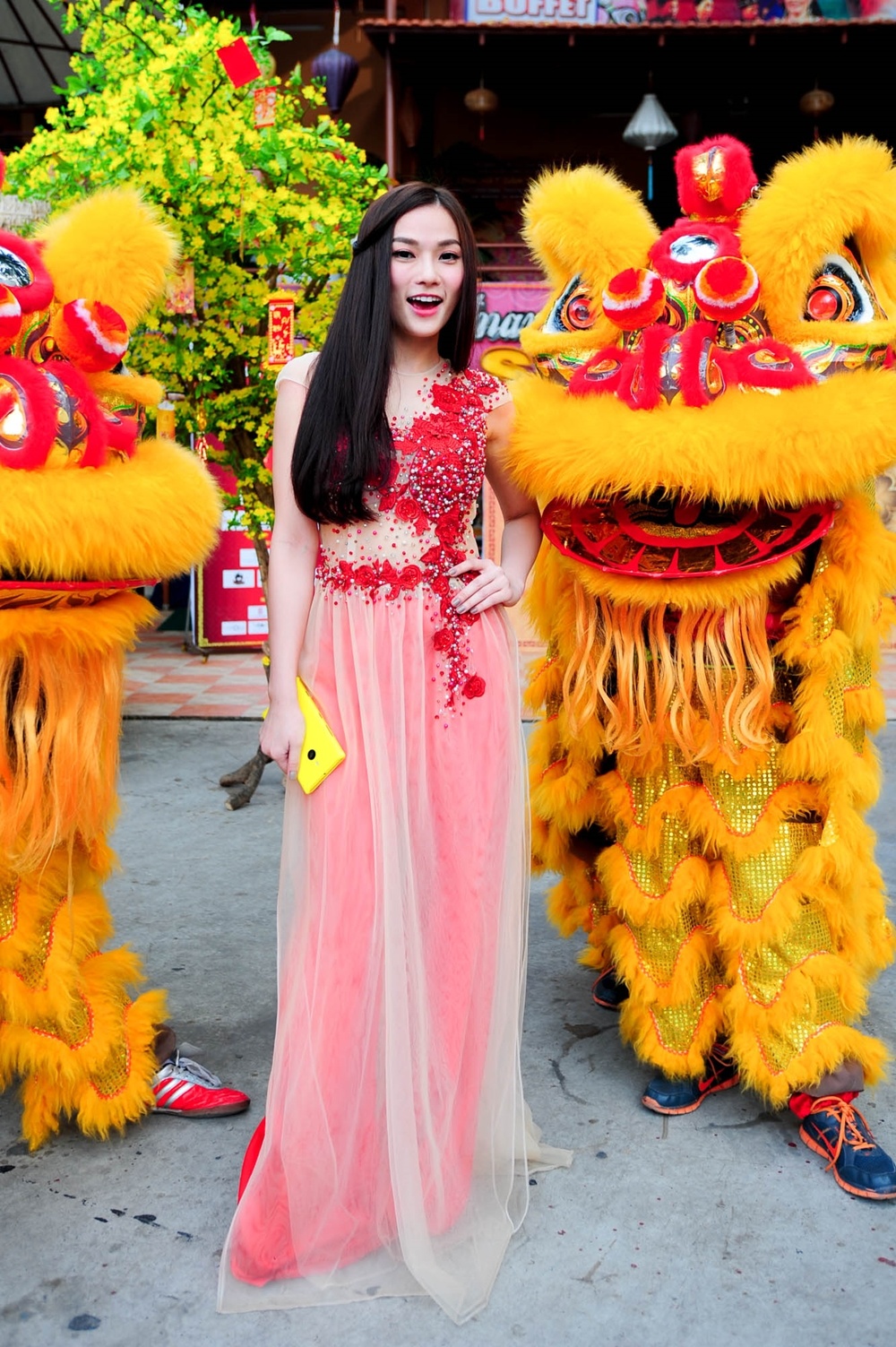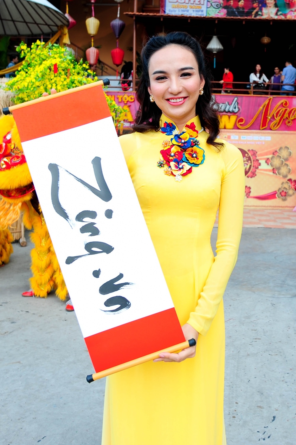 | Hoa hậu Ngọc Diễm mang chút ấm áp trong tà áo vàng. |