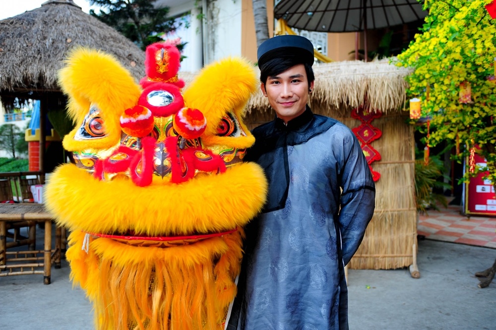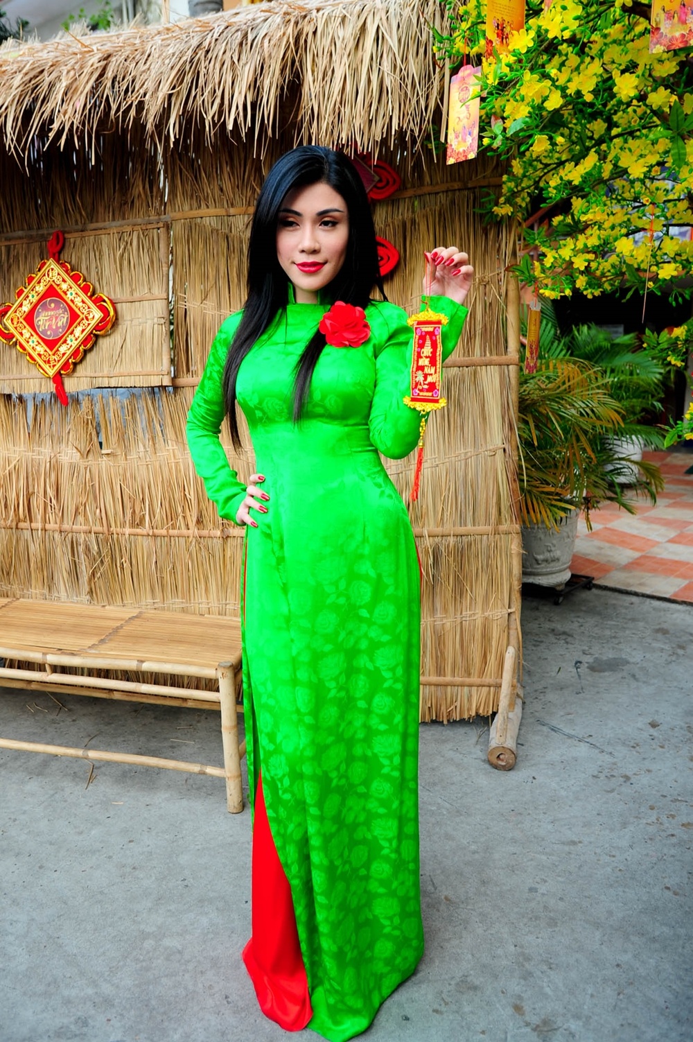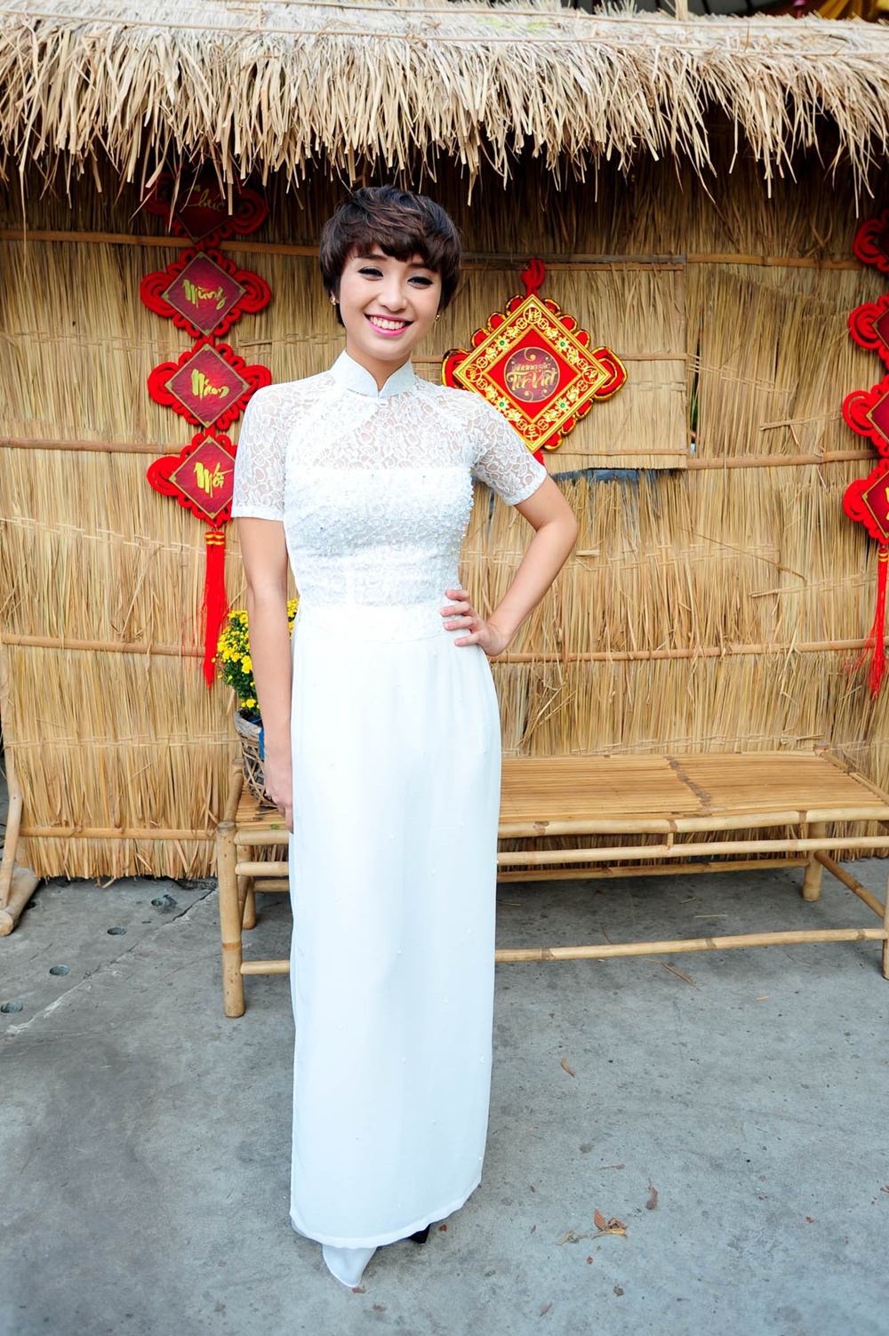| Chí Thiện chọn cho mình bộ áo dài truyền thống của Bắc bộ. |