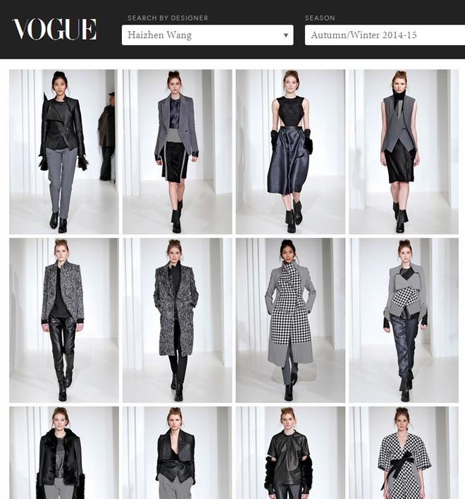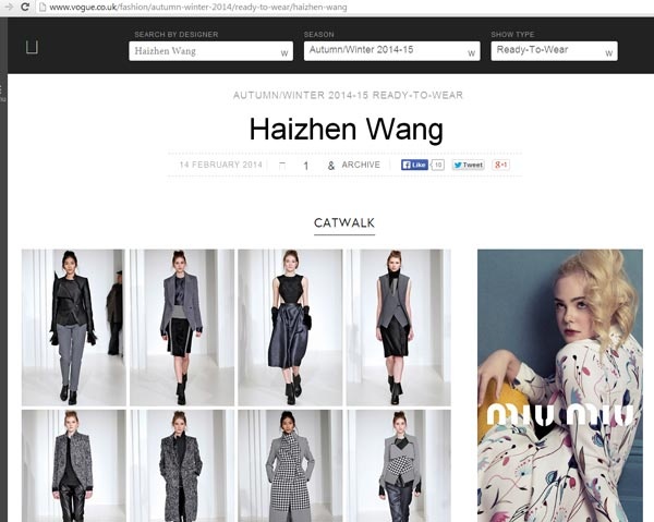 | Ở một show diễn khác cùng ngày 14/2 là Haizhen Wang - nhà thiết kế gốc Trung Quốc, hình ảnh Hoàng Thùy và các người mẫu đã được đăng tải trên trang điện tử của tạp chí thời trang số 1 thế giới Voque. |