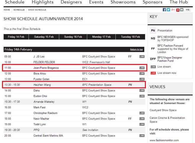 | Thông tin lịch diễn của Hoàng Thùy trên trang website của Tuần lễ thời trang thu đông London 2014. |