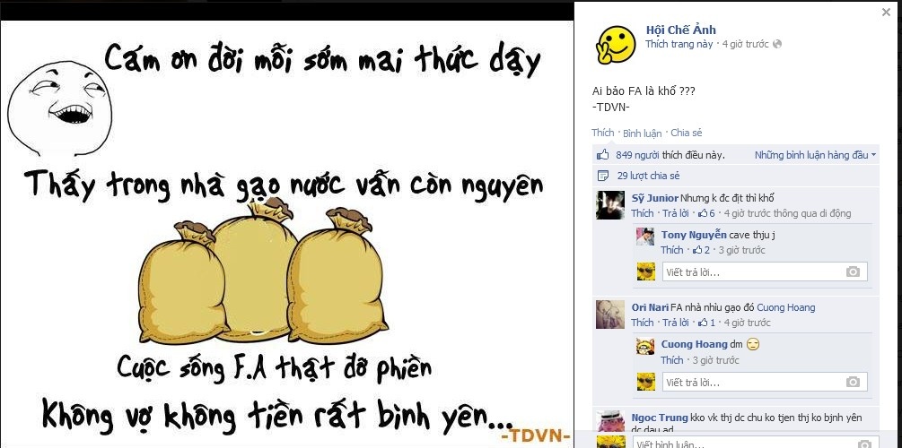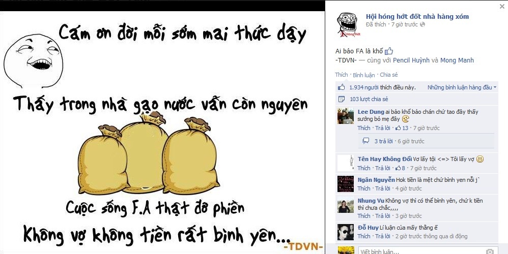 Dân FA (Forever Alone) được an ủi và có thêm niềm vui, khi không tiền, không “gấu” nhưng vẫn còn có Bao gạo để thổi cơm qua ngày. Cư dân mạng cũng khá hứng thú với ý nghĩa của một bức tranh “comic” với ý nghĩa bao gạo còn có lúc đầy vơi, sống với nhau làm sao tránh được những lức cãi nhau, hờn giận.