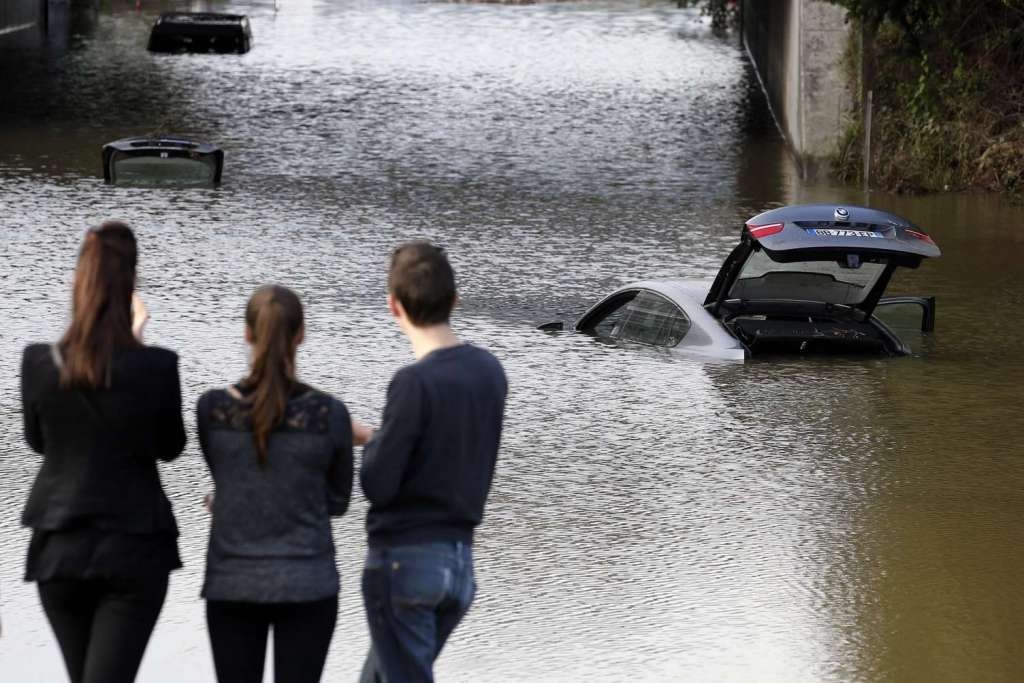 Nước ngập gần tới nóc xe. Tổng thống Pháp Francois Hollande hôm 4/10 đích thân thị sát các khu vực ngập nặng và ban bố tình trạng “thảm họa tự nhiên” quốc gia sau trận lụt. Ảnh: EPA |