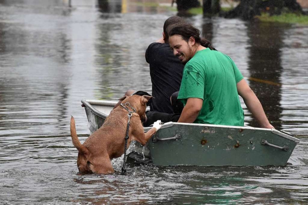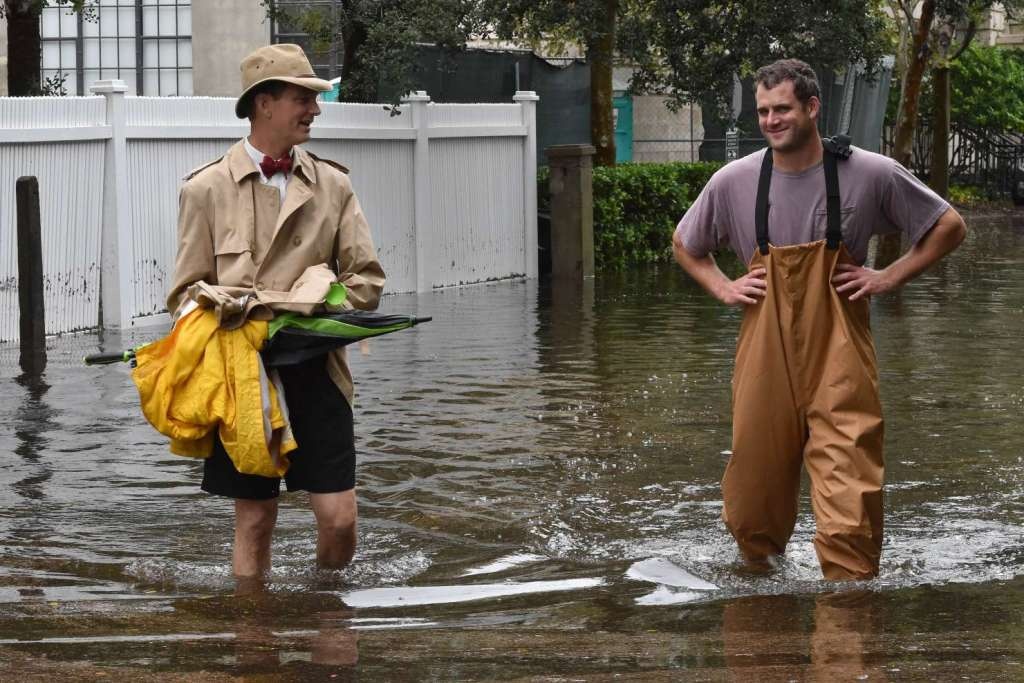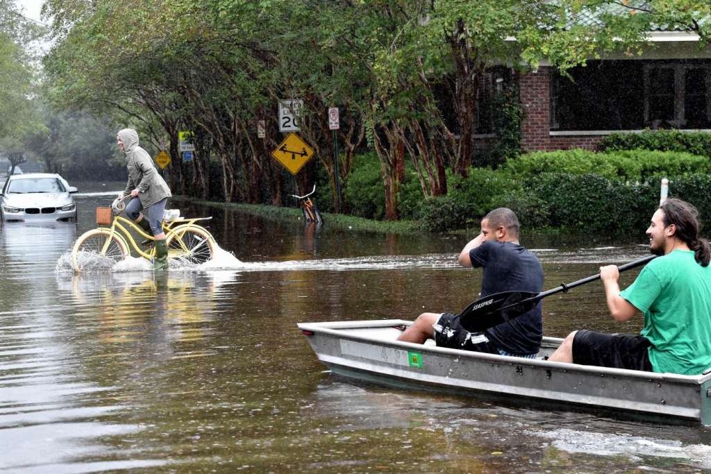 Hai người đàn ông chèo thuyền trong khi một người dắt xe đạp giữa dòng nước ngập thành phố Charleston. Đây được coi là trận mưa lịch sử và nghiêm trọng nhất ở bang Nam Carolina trong nhiều năm qua. Ảnh: AFP |