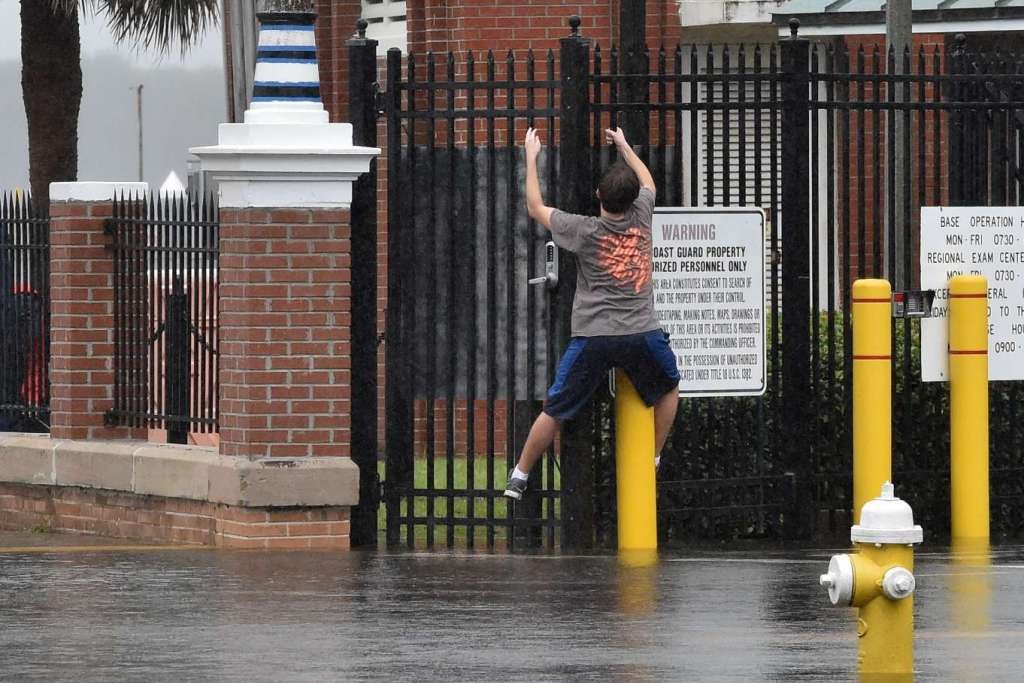 Một cậu bé cố bám lấy cổng rào bên ngoài một tòa nhà khi nước tràn đường. Ảnh: AFP |