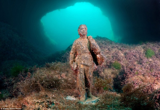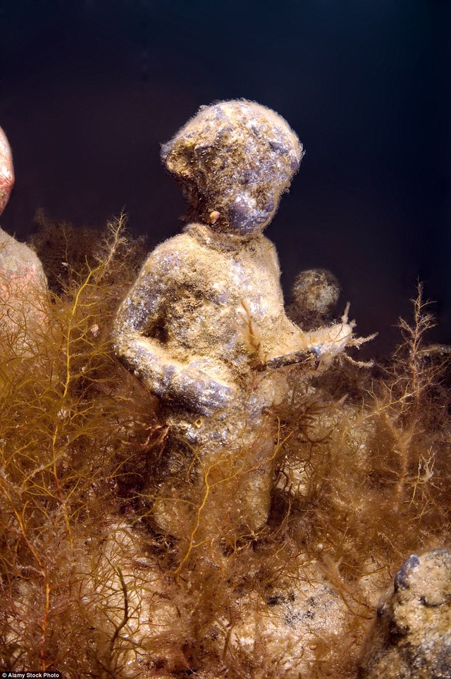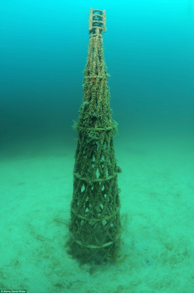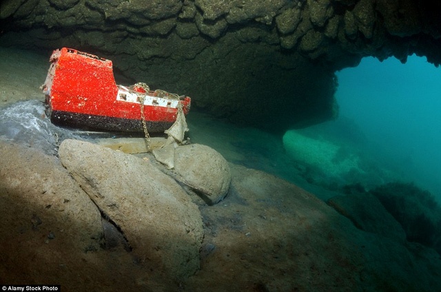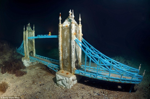Sáng rực rỡ dưới đáy biển âm u là một mô hình tàu đắm có màu đỏ còn khá mới . |