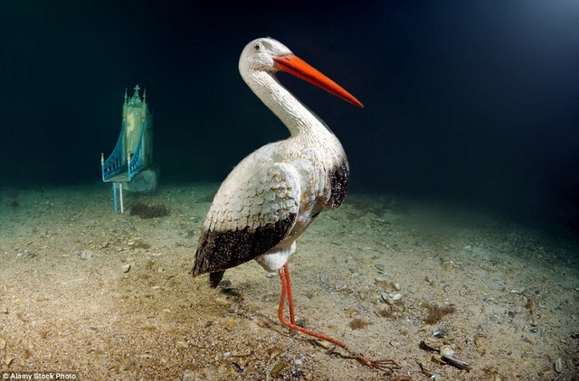 Một chú bồ nông đang rón rén đi dưới đáy biển . |