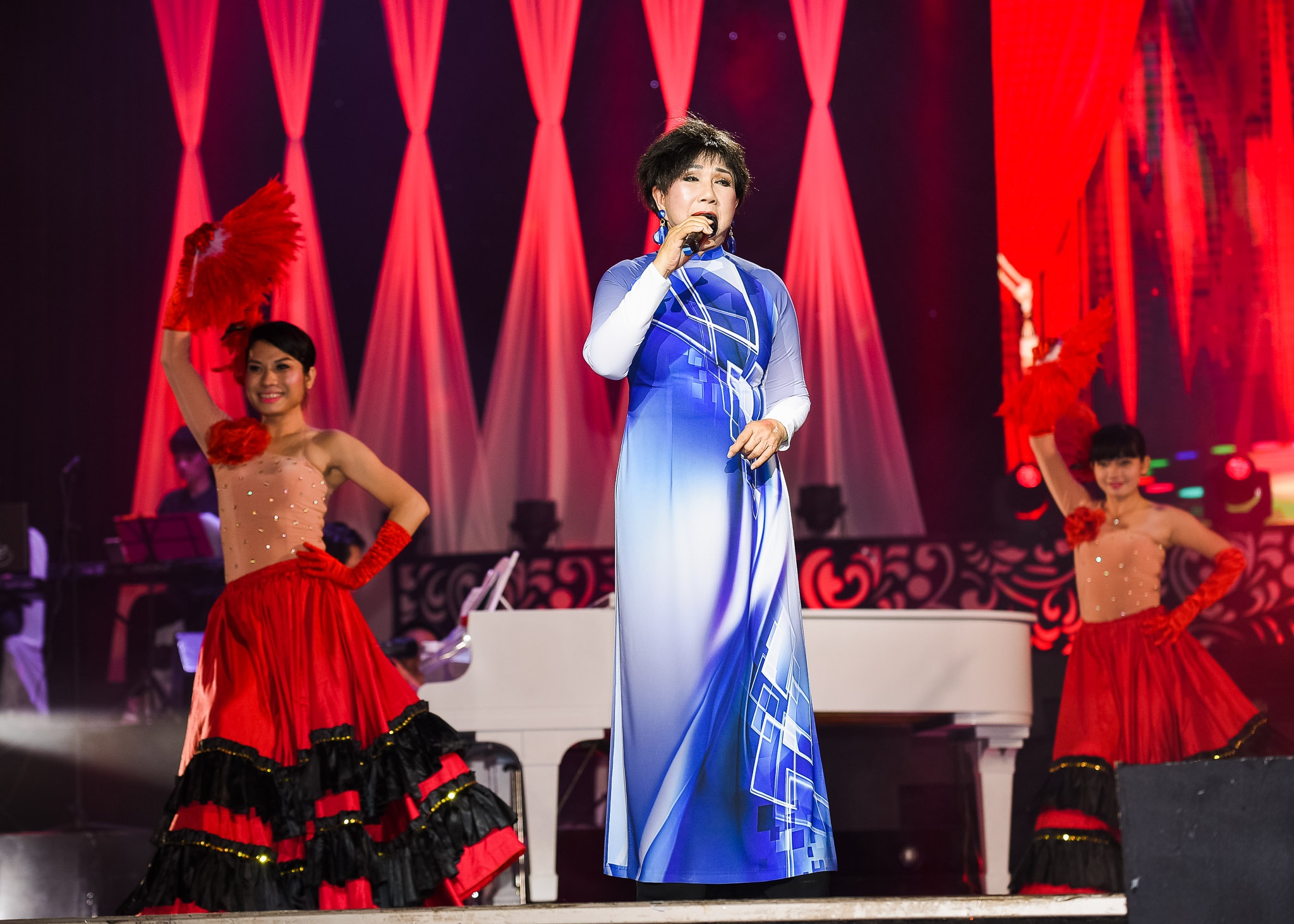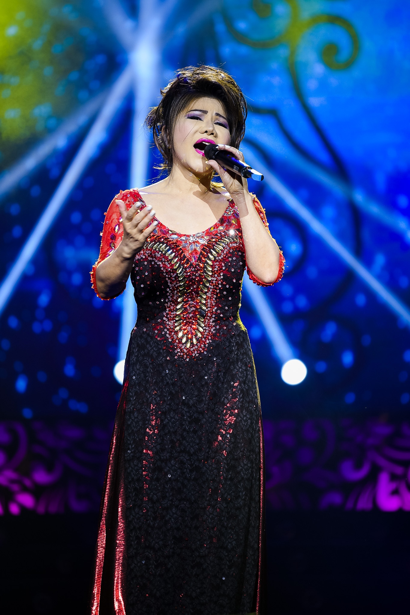 Nữ ca sĩ hải ngoại nức nở trong phần trình diễn solo. Chị đưa vào cảm xúc mộc mạc khi hát Đừng trách em tội nghiệp làm khán giả vỗ tay cuồng nhiệt. |
