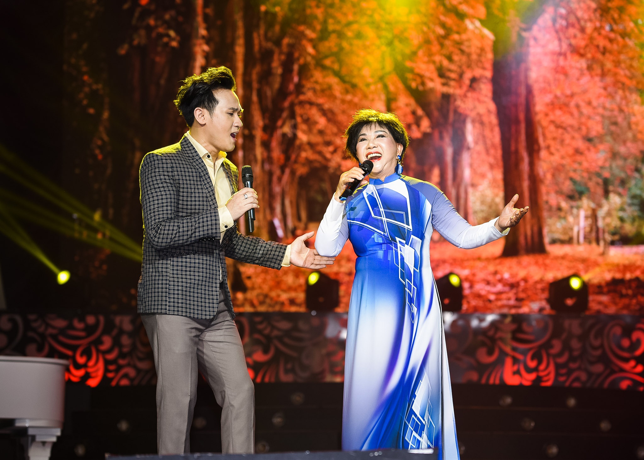 Nguyên Vũ tiếp tục cầm tay song ca cùng nữ danh ca Lệ Thu trong ca khúc lãng mạn – Mùa thu cho em. Mặc dù hát chung với 2 nữ ca sĩ nổi tiếng của hải ngoại nhưng nam ca sĩ khá vững vàng và thể hiện được bản lĩnh trên sân khấu. |