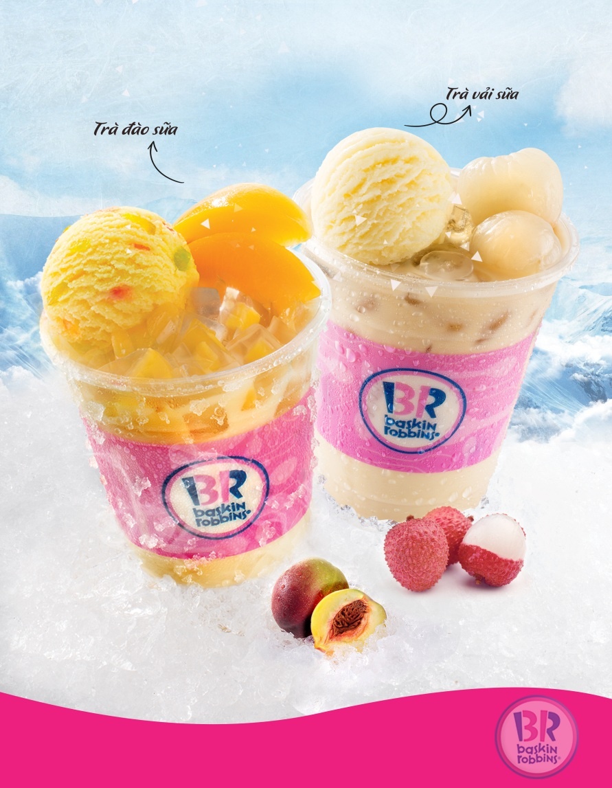 Cảm nhận ngay hương vị mới lạ của trà đào sữa và trà vải sữa - đảo quốc nhiệt đới từ Baskin Robbins. Đó vẫn là hương thơm tự nhiên của trái cây nhiệt đới tươi mát, kết hợp với suối sữa tươi nguyên chất bổ dưỡng. Điều đặc biệt nhất chỉ có ở mỗi ly nước là có ngay luôn một viên kem Baskin Robbins cho mỗi đảo quốc. Thật tuyệt khi vừa uống vừa nhâm nhi trái cây căng mọng, vị béo của kem.