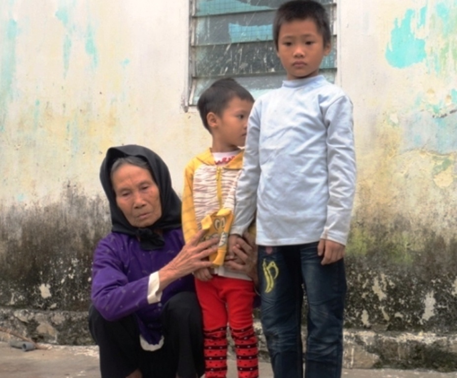 | Bà nội bên 2 đứa con thơ dại của Hải. |