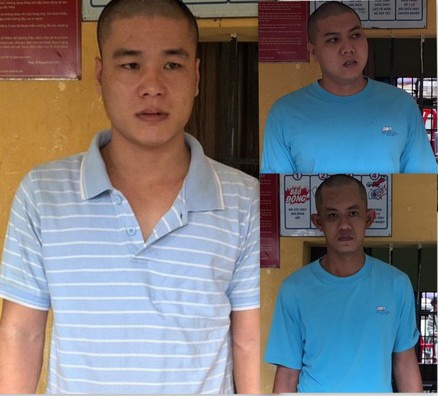 | Bình (áo sọc) cùng 2 đồng bọn bị công an bắt giữ. |