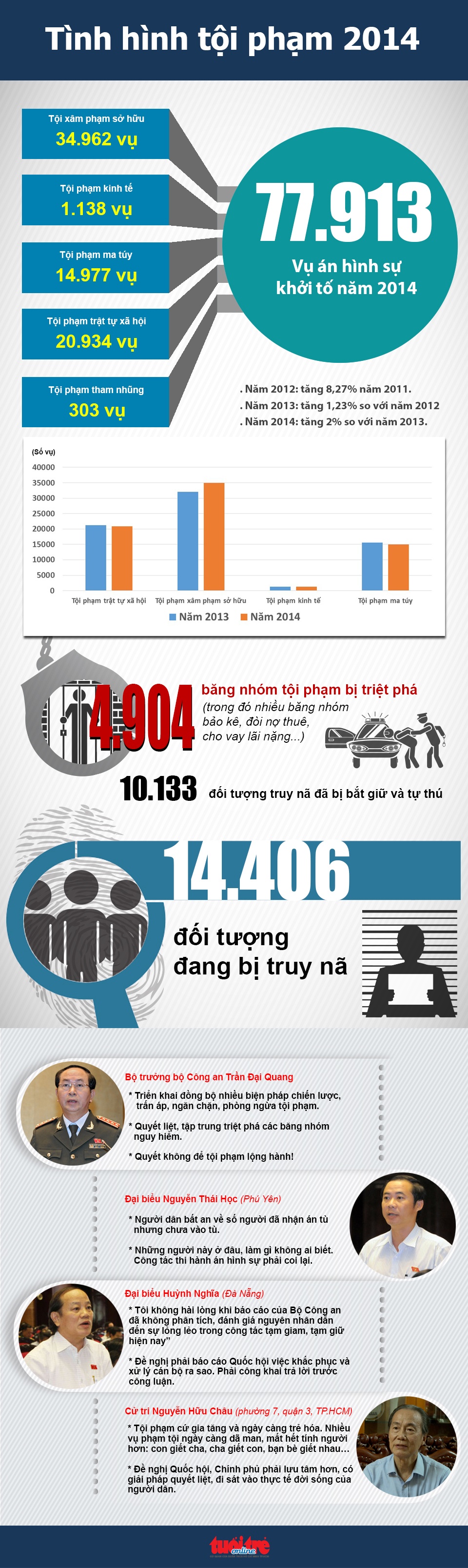 Báo cáo của Bộ Công an tại quốc hội ngày 25/10 cho thấy số vụ phạm tội năm 2014 vẫn tiếp tục gia tăng, diễn biến phức tạp hơn khiến cử tri thấy bất an.