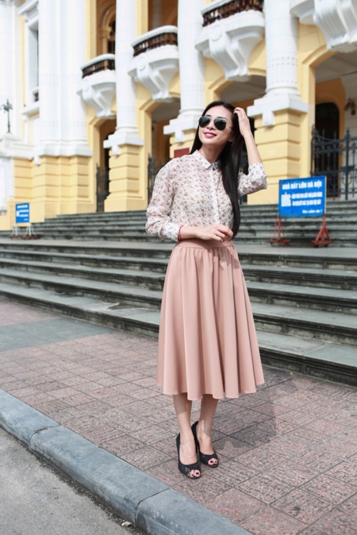 Phong cách dao phố lãng mạng với sơ mi hoa pastel và chân váy midi xòe.