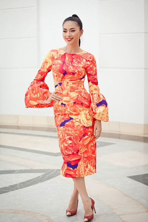 Người đẹp khoe dáng trong một thiết kể tay ống loe với những bông hoa rực rỡ.