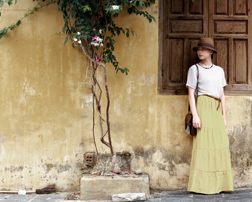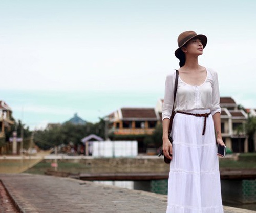 | Đầm maxi được Vân Ngô mix khéo léo cùng áo sơ mi lụa và mũ dạ. Từ kiểu dáng cho tới màu sắc của bộ trang phục đều được cô lựa chọn rất cẩn thận để mang hồn thu vào trong. |