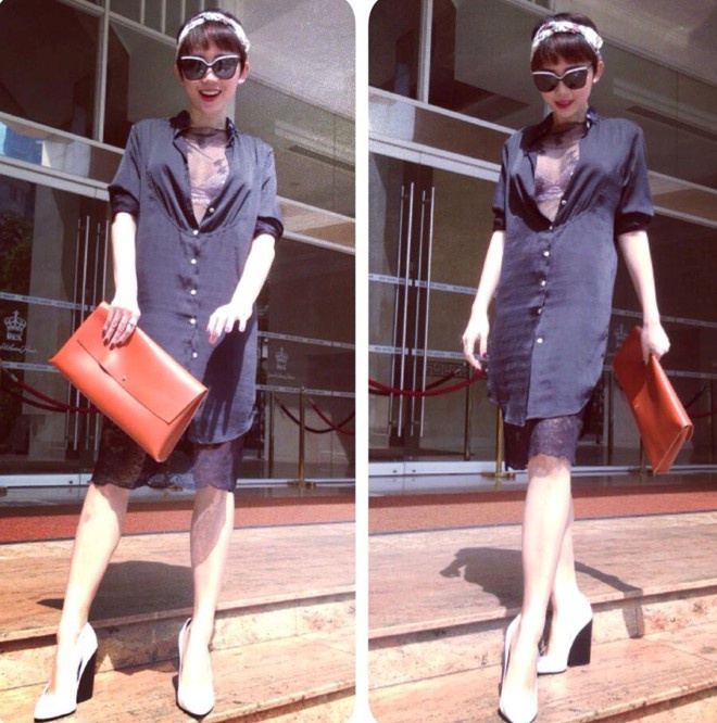 Cô khá tâm đắc với nhiều kiểu mốt thắt lưng được phối phá cách cùng trang phục.