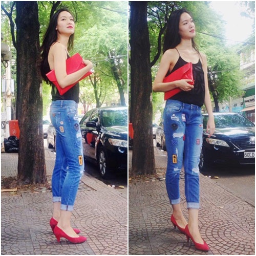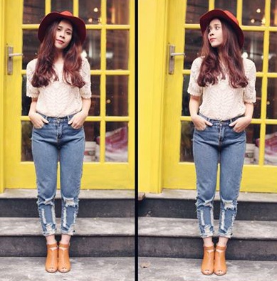 | ... nhưng đôi khi cũng rất phóng khoáng với kiểu quần jeans xé bụi phủi. |
