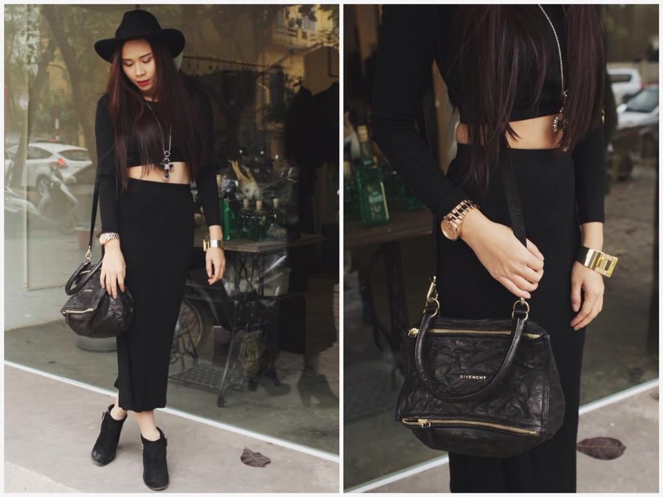 Thắt lưng trở thành điểm nhấn ấn tượng cho bộ cánh đồng tông đen.