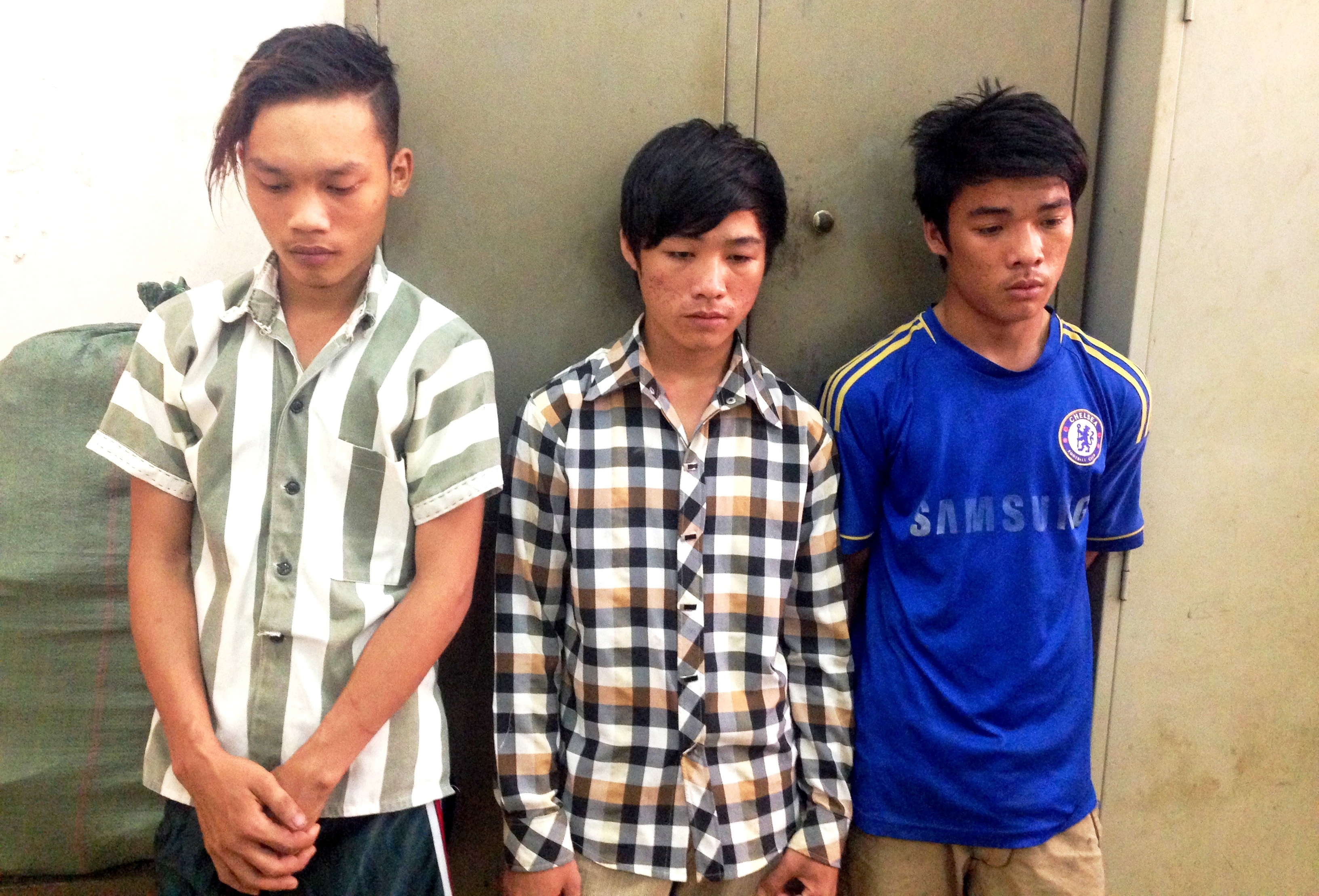| Linh, Hiếu, Thoại (từ trái sang) tại cơ quan công an. Ảnh: Đ.M. |