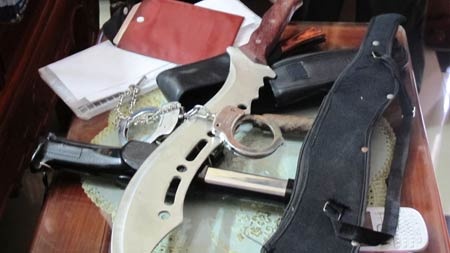 | Dao, còng số 8, dùi cui điện... được tìm thấy trên xe ô tô của Thúy và Duyên. |