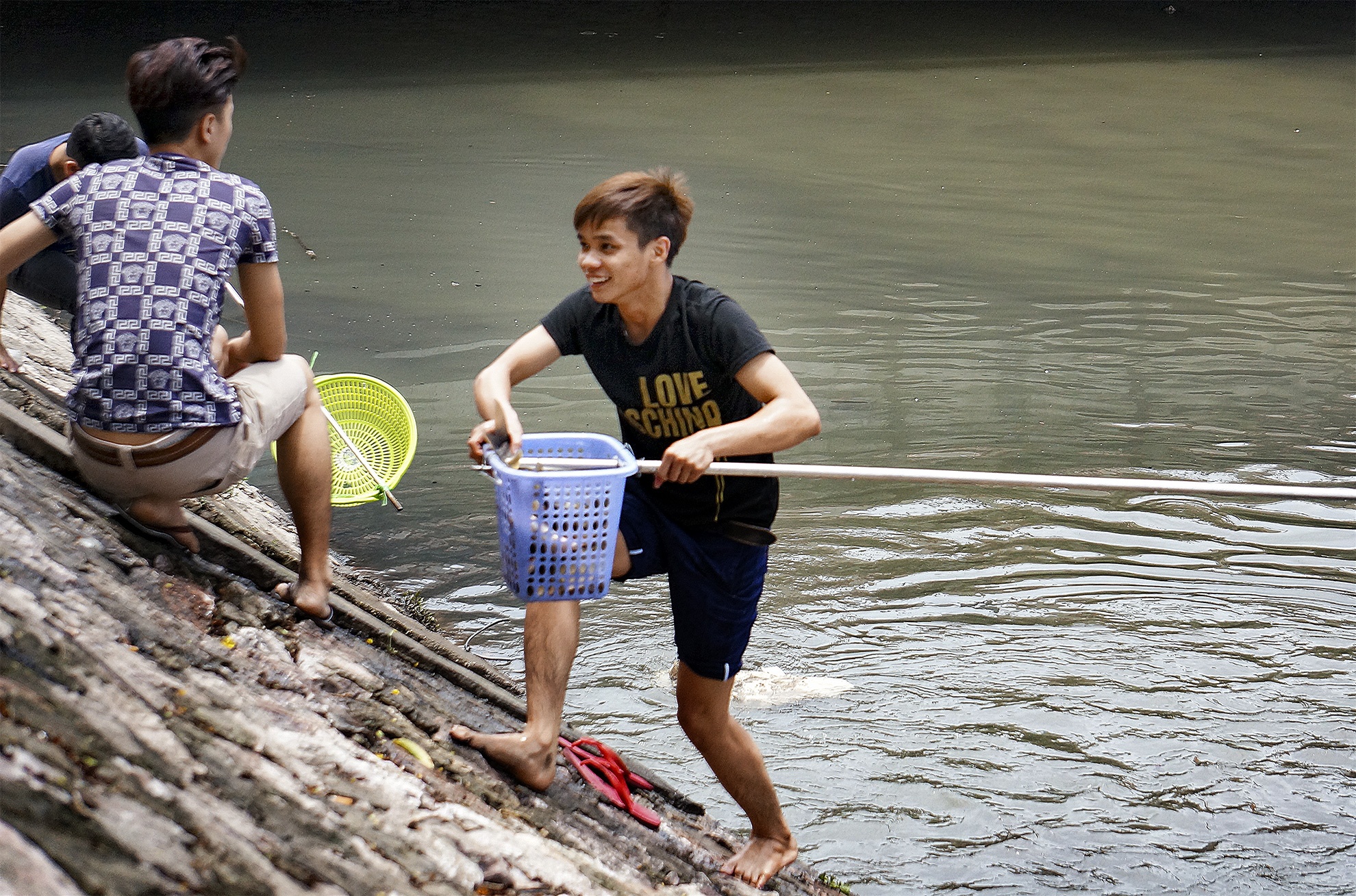 Sau trận mưa kéo dài cả ngày đến tận đêm 24/6, rất nhiều cá tràn ra sông Kim Ngưu theo đường ống cống. Sáng nay, một số thanh niên đã tranh thủ vây bắt.